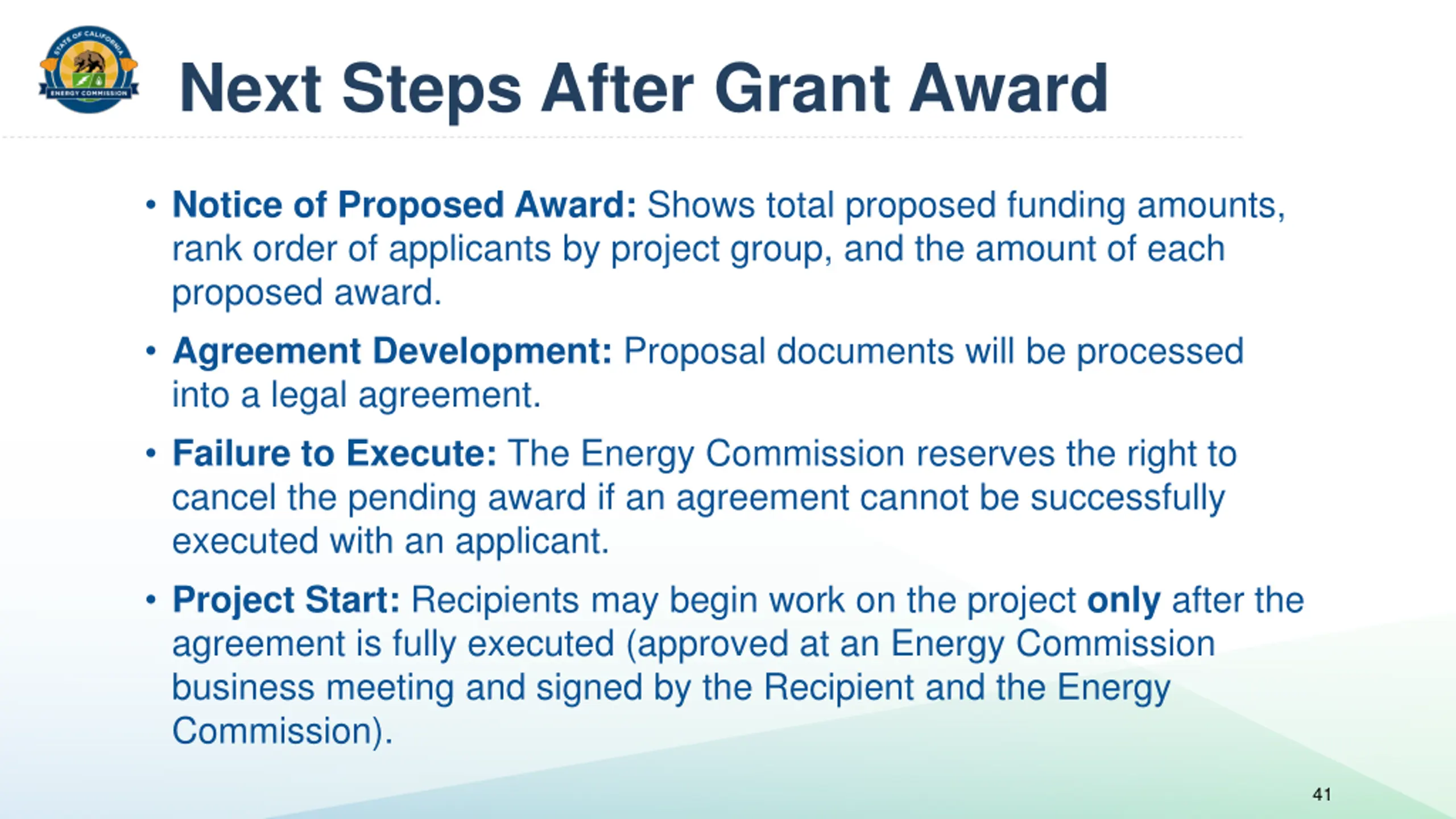 Next Steps After Grant Award Notice of Proposed Award: Shows total proposed funding amounts, rank order of applicants by project group, and the amount of each proposed award. Agreement Development: Proposal documents will be processed into a legal agreement. Failure to Execute: The Energy Commission reserves the right to cancel the pending award if an agreement cannot be successfully executed with an applicant. Project Start: Recipients may begin work on the project only after the agreement is fully executed (approved at an Energy Commission business meeting and signed by the Recipient and the Energy Commission). 41