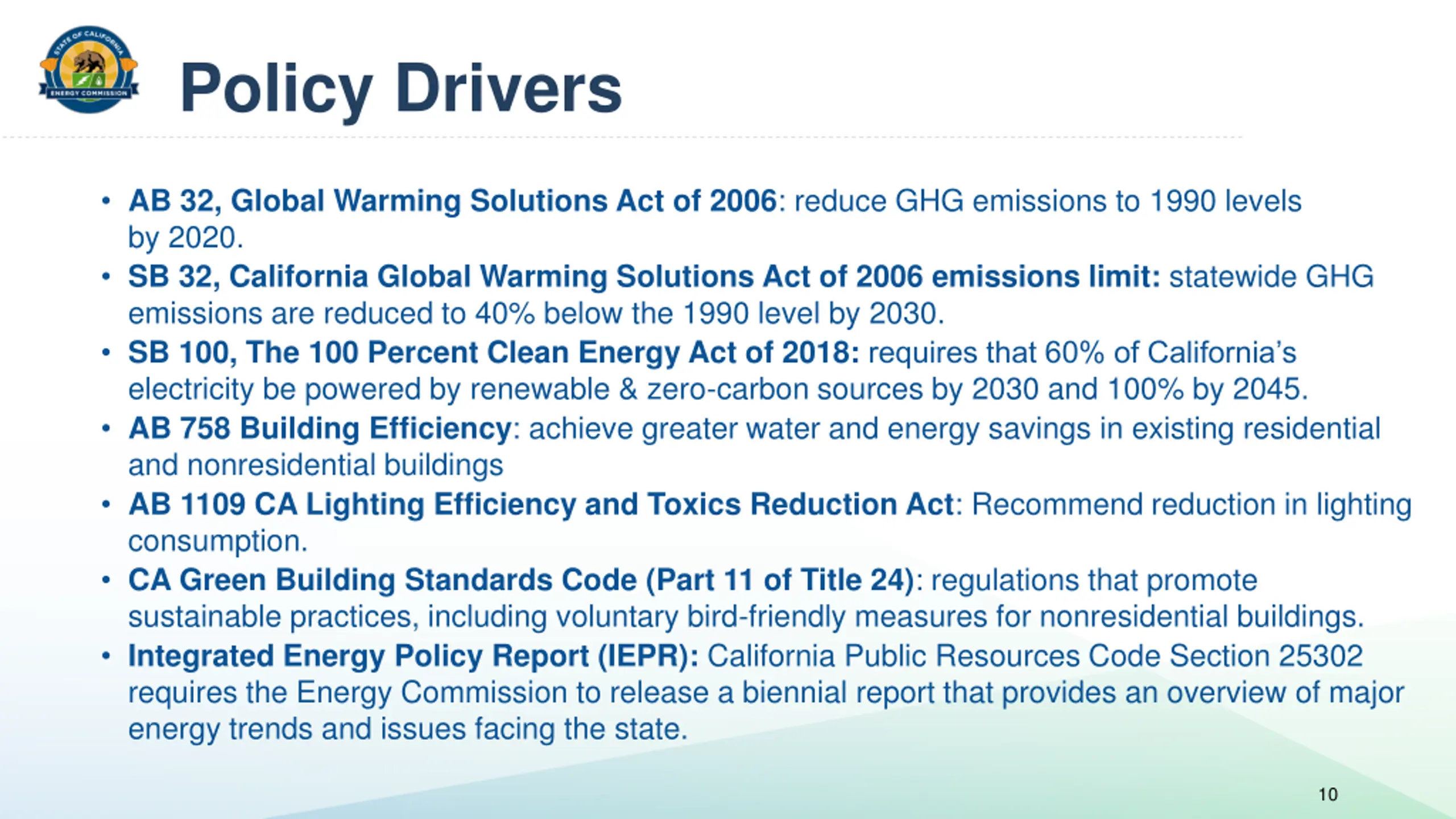 Policy Drivers AB 32, Global Warming Solutions Act of 2006: reduce GHG emissions to 1990 levels by 2020. SB 32, California Global Warming Solutions Act of 2006 emissions limit: statewide GHG emissions are reduced to 40% below the 1990 level by 2030. SB 100, The 100 Percent Clean Energy Act of 2018: requires that 60% of California s electricity be powered by renewable & zero-carbon sources by 2030 and 100% by 2045. AB 758 Building Efficiency: achieve greater water and energy savings in existing residential and nonresidential buildings AB 1109 CA Lighting Efficiency and Toxics Reduction Act: Recommend reduction in lighting consumption. CA Green Building Standards Code (Part 11 of Title 24):regulations that promote sustainable practices, including voluntary bird-friendly measures for nonresidential buildings. Integrated Energy Policy Report (IEPR): California Public Resources Code Section 25302 requires the Energy Commission to release a biennial report that provides an overview of major energy trends and issues facing the state. 10