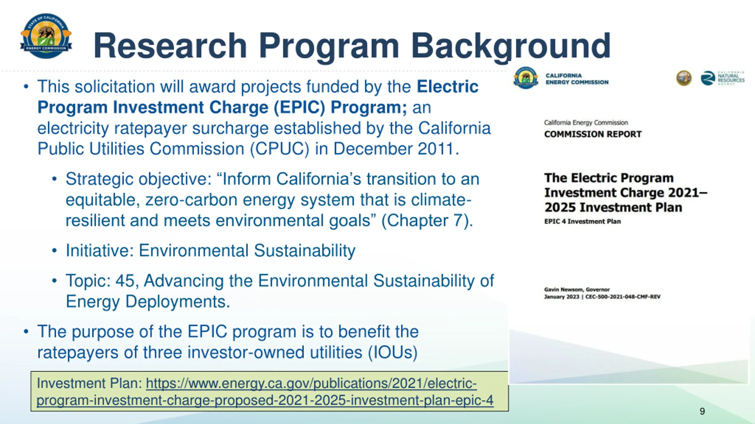 Research Program Background This solicitation will award projects funded by the Electric Program Investment Charge (EPIC) Program; an electricity ratepayer surcharge established by the California Public Utilities Commission (CPUC) in December 2011. Strategic objective: Inform California s transition to an equitable, zero-carbon energy system that is climate- resilient and meets environmental goals (Chapter 7). Initiative: Environmental Sustainability Topic: 45, Advancing the Environmental Sustainability of Energy Deployments. The purpose of the EPIC program is to benefit the ratepayers of three investor-owned utilities (IOUs) Investment Plan: https://www.energy.ca.gov/publications/2021/electric- program-investment-charge-proposed-2021-2025-investment-plan-epic-4 9