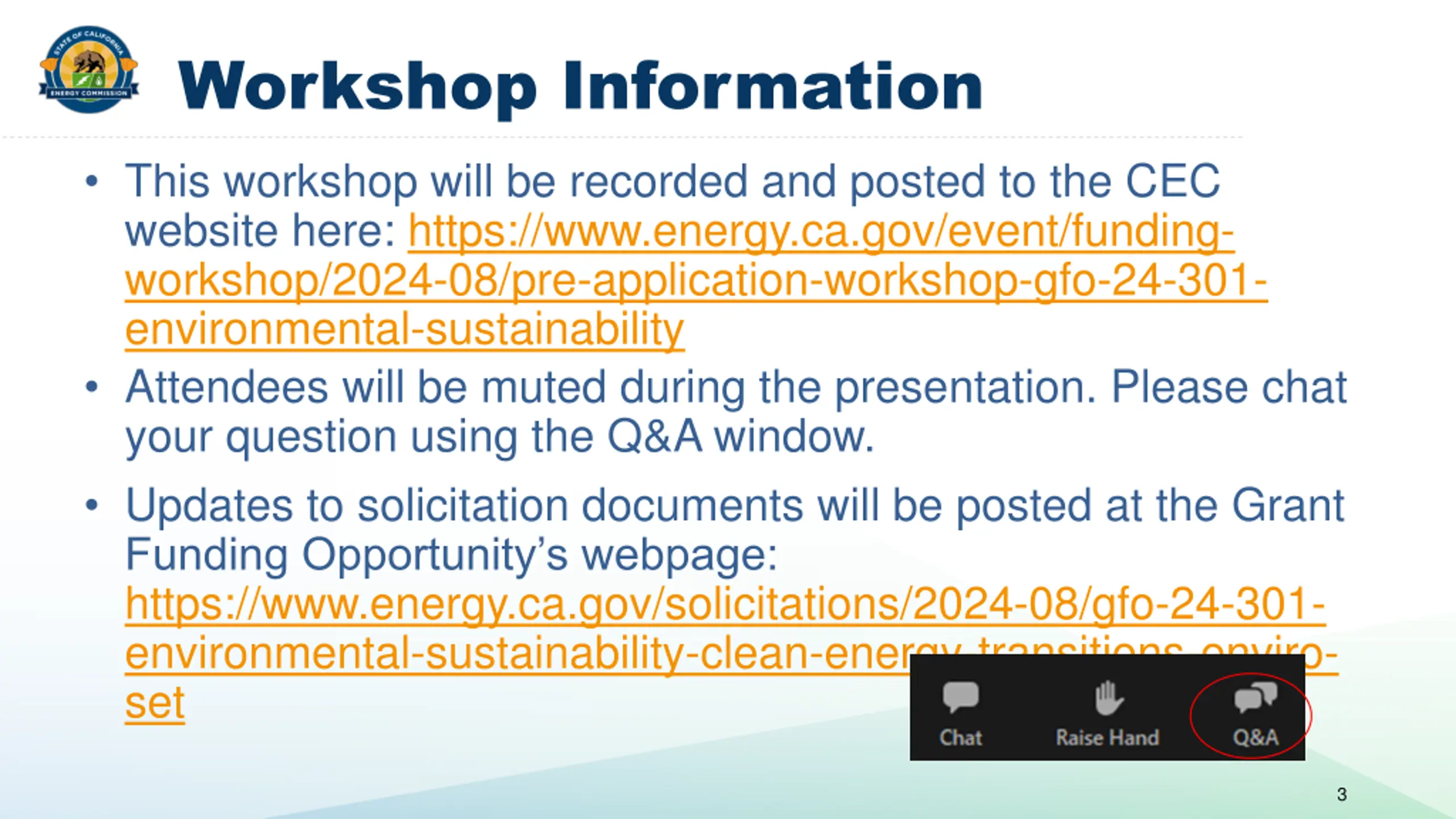 Workshop Information This workshop will be recorded and posted to the CEC website here: https://www.energy.ca.gov/event/funding- workshop/2024-08/pre-application-workshop-gfo-24-301- environmental-sustainability Attendees will be muted during the presentation. Please chat your question using the Q&A window. Updates to solicitation documents will be posted at the Grant Funding Opportunity s webpage: https://www.energy.ca.gov/solicitations/2024-08/gfo-24-301- environmental-sustainability-clean-energy-transitions-enviro- set 3