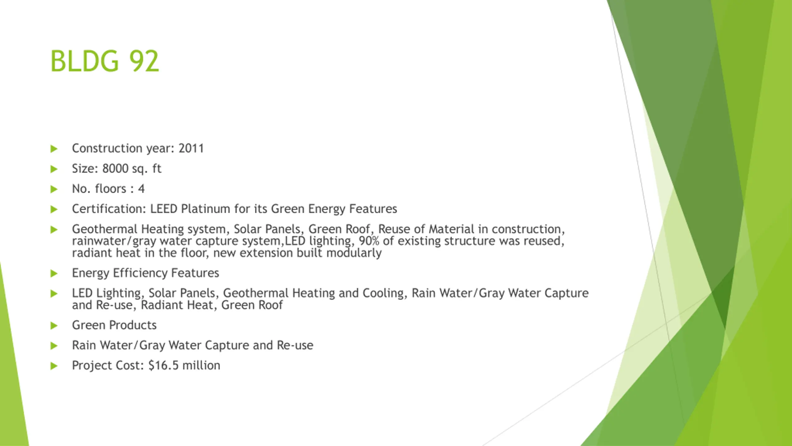 BLDG 92 Construction year: 2011 Size: 8000 sq. ft No. floors : 4 Certification: LEED Platinum for its Green Energy Features Geothermal Heating system, Solar Panels, Green Roof, Reuse of Material in construction, rainwater/gray water capture system,LED lighting, 90% of existing structure was reused, radiant heat in the floor, new extension built modularly Energy Efficiency Features LED Lighting, Solar Panels, Geothermal Heating and Cooling, Rain Water/Gray Water Capture and Re-use, Radiant Heat, Green Roof Green Products Rain Water/Gray Water Capture and Re-use Project Cost: $16.5 million