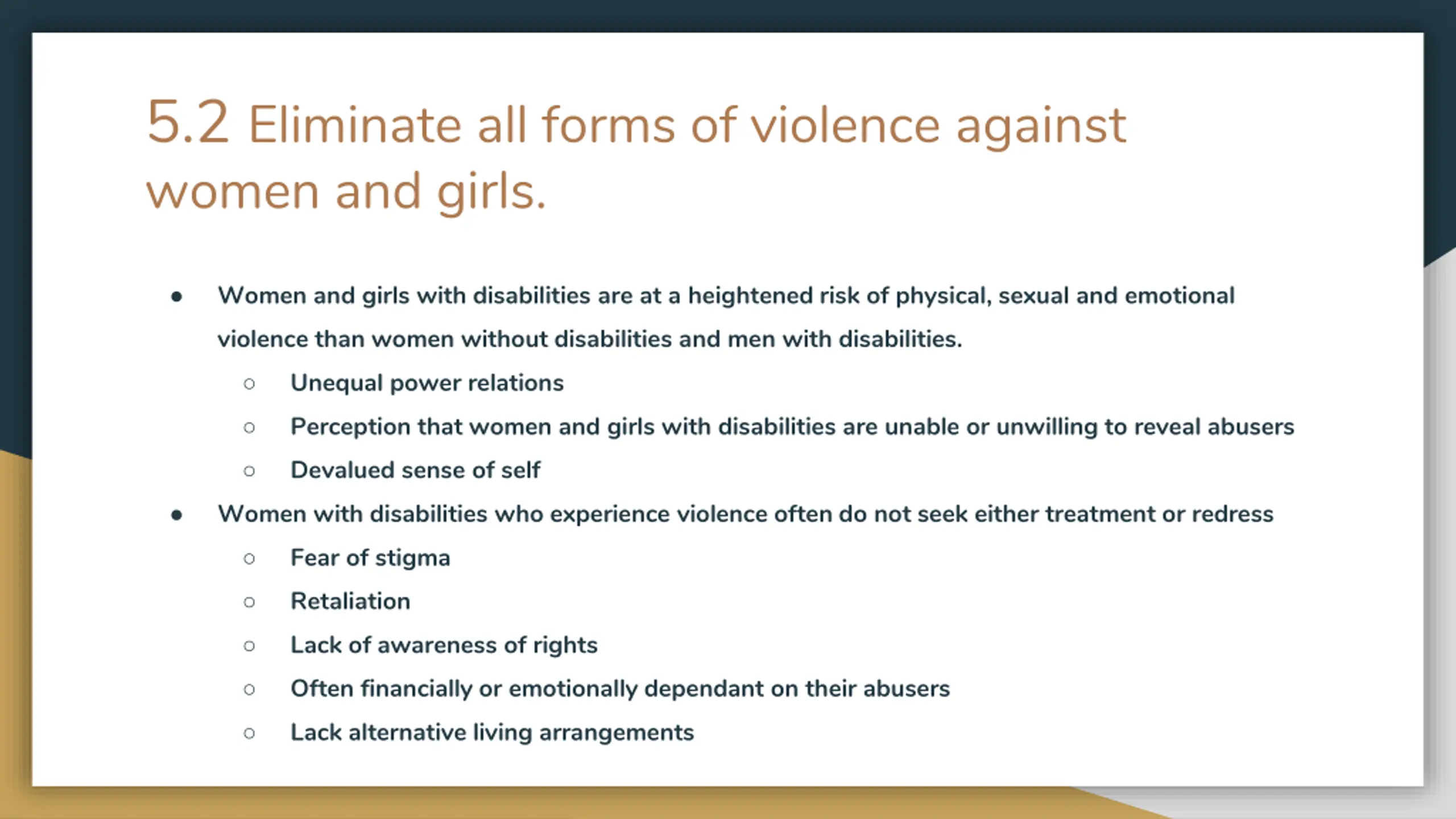 5.2 Eliminate all forms of violence against women and girls. Women and girls with disabilities are at a heightened risk of physical, sexual and emotional violence than women without disabilities and men with disabilities. Unequal power relations Perception that women and girls with disabilities are unable or unwilling to reveal abusers Devalued sense of self Women with disabilities who experience violence often do not seek either treatment or redress Fear of stigma Retaliation Lack of awareness of rights Often financially or emotionally dependant on their abusers Lack alternative living arrangements