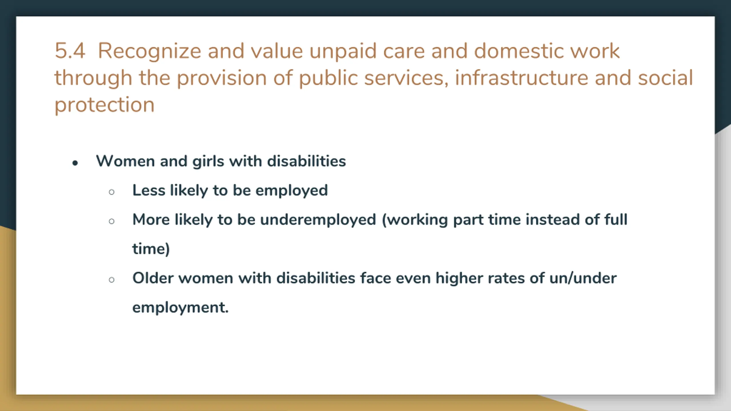 5.4 Recognize and value unpaid care and domestic work through the provision of public services, infrastructure and social protection Women and girls with disabilities Less likely to be employed More likely to be underemployed (working part time instead of full time) Older women with disabilities face even higher rates of un/under employment.