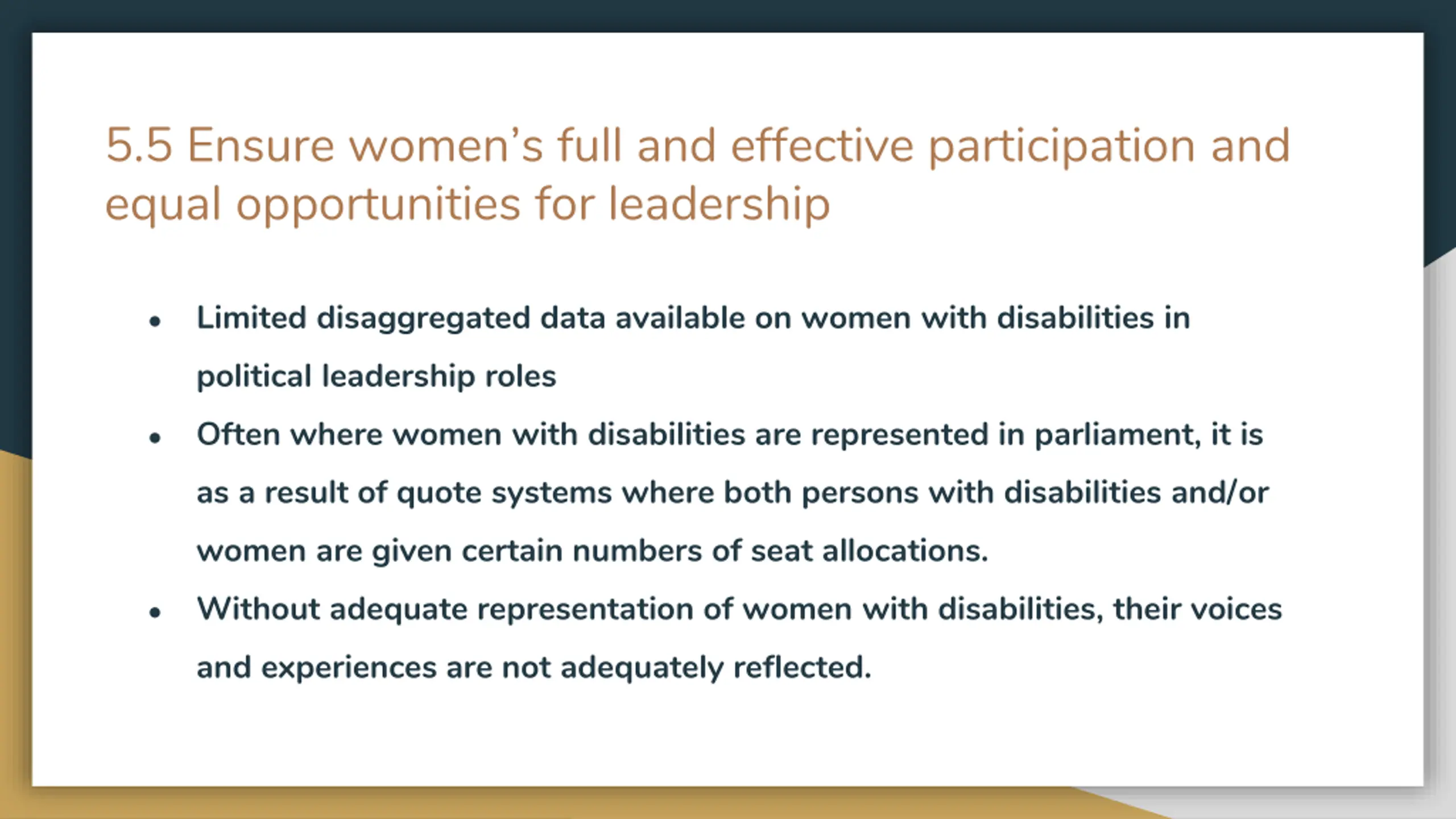 5.5 Ensure womens full and effective participation and equal opportunities for leadership Limited disaggregated data available on women with disabilities in political leadership roles Often where women with disabilities are represented in parliament, it is as a result of quote systems where both persons with disabilities and/or women are given certain numbers of seat allocations. Without adequate representation of women with disabilities, their voices and experiences are not adequately reflected.