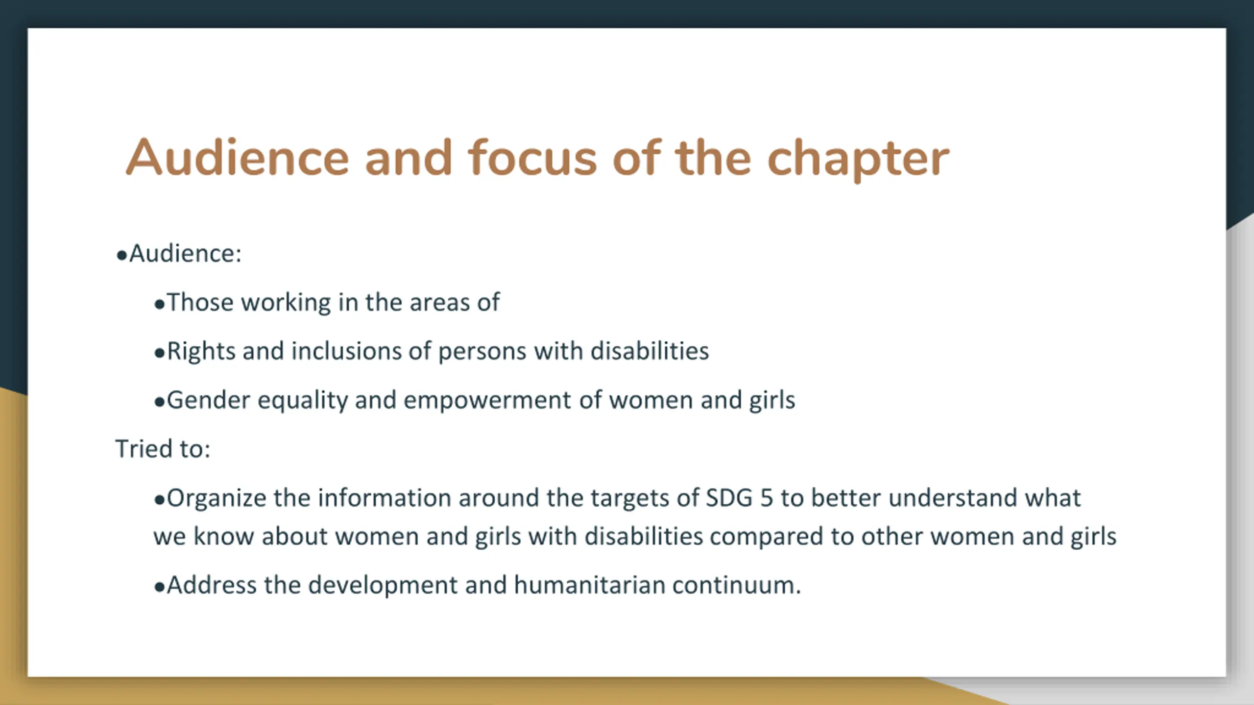 Audience and focus of the chapter Audience: Those working in the areas of Rights and inclusions of persons with disabilities Gender equality and empowerment of women and girls Tried to: Organize the information around the targets of SDG 5 to better understand what we know about women and girls with disabilities compared to other women and girls Address the development and humanitarian continuum.