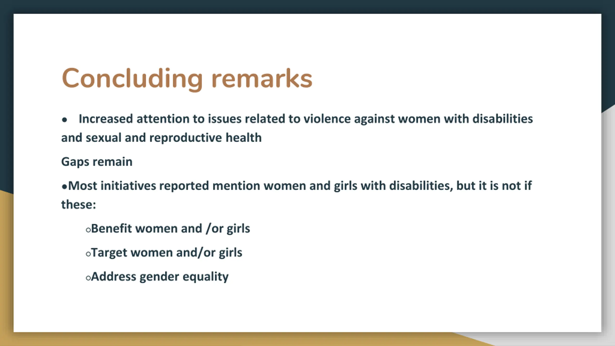 Concluding remarks Increased attention to issues related to violence against women with disabilities and sexual and reproductive health Gaps remain Most initiatives reported mention women and girls with disabilities, but it is not if these: Benefit women and /or girls Target women and/or girls Address gender equality