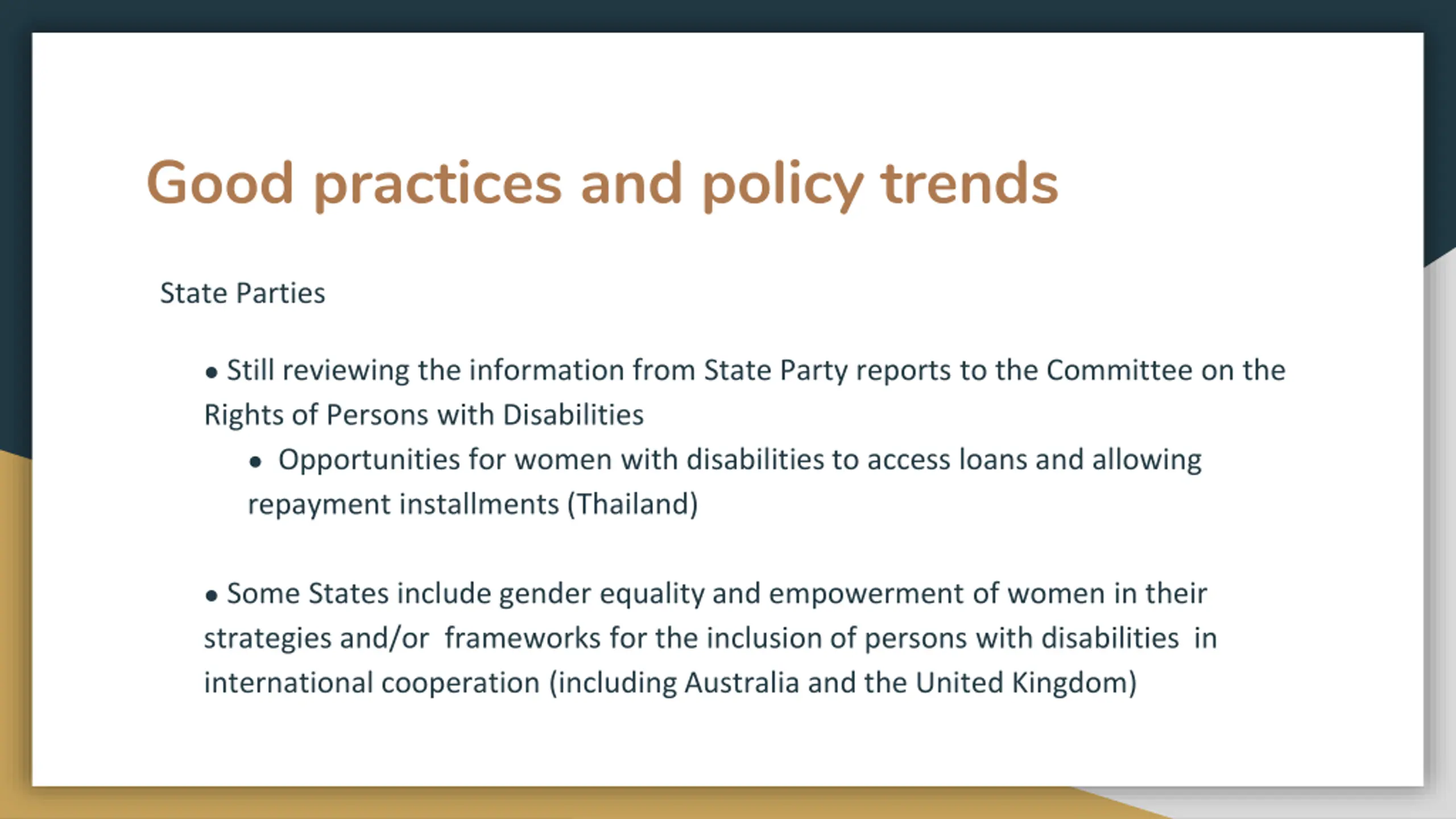 Good practices and policy trends State Parties Still reviewing the information from State Party reports to the Committee on the Rights of Persons with Disabilities Opportunities for women with disabilities to access loans and allowing repayment installments (Thailand) Some States include gender equality and empowerment of women in their strategies and/or frameworks for the inclusion of persons with disabilities in international cooperation (including Australia and the United Kingdom)