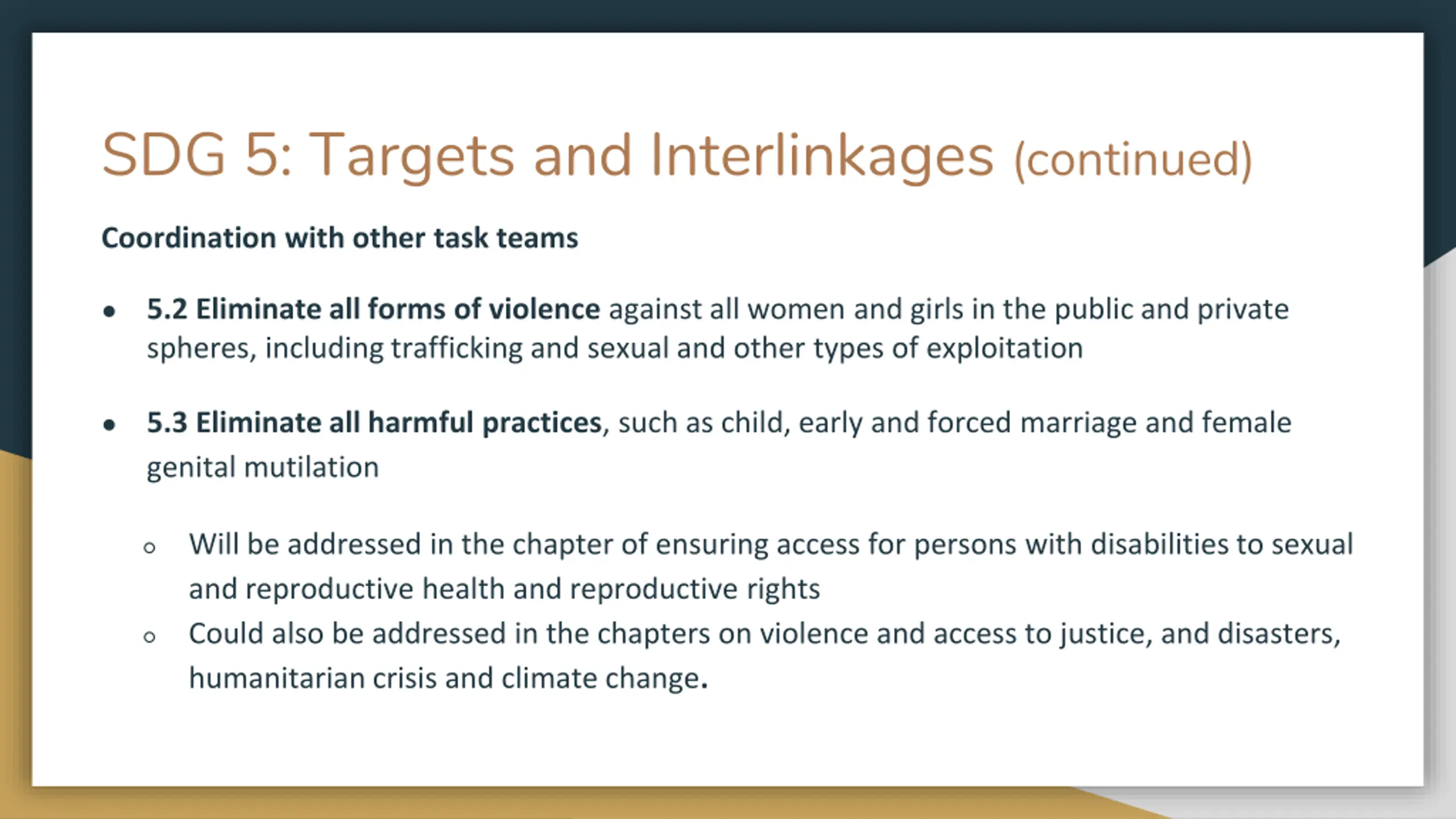 SDG 5: Targets and Interlinkages (continued) Coordination with other task teams 5.2 Eliminate all forms of violence against all women and girls in the public and private spheres, including trafficking and sexual and other types of exploitation 5.3 Eliminate all harmful practices, such as child, early and forced marriage and female genital mutilation Will be addressed in the chapter of ensuring access for persons with disabilities to sexual and reproductive health and reproductive rights Could also be addressed in the chapters on violence and access to justice, and disasters, humanitarian crisis and climate change.