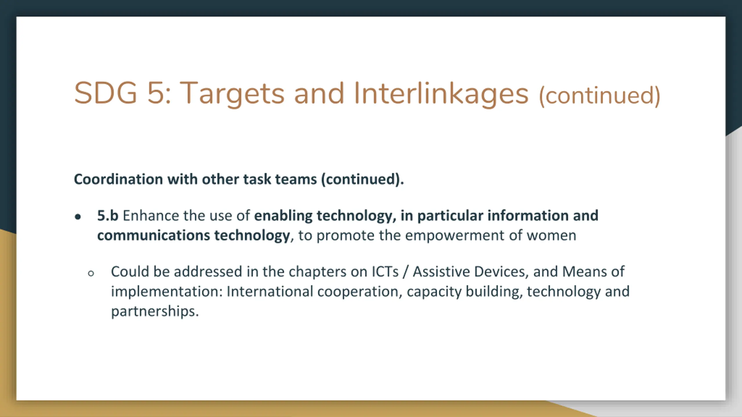 SDG 5: Targets and Interlinkages (continued) Coordination with other task teams (continued). 5.b Enhance the use of enabling technology, in particular information and communications technology, to promote the empowerment of women Could be addressed in the chapters on ICTs / Assistive Devices, and Means of implementation: International cooperation, capacity building, technology and partnerships.