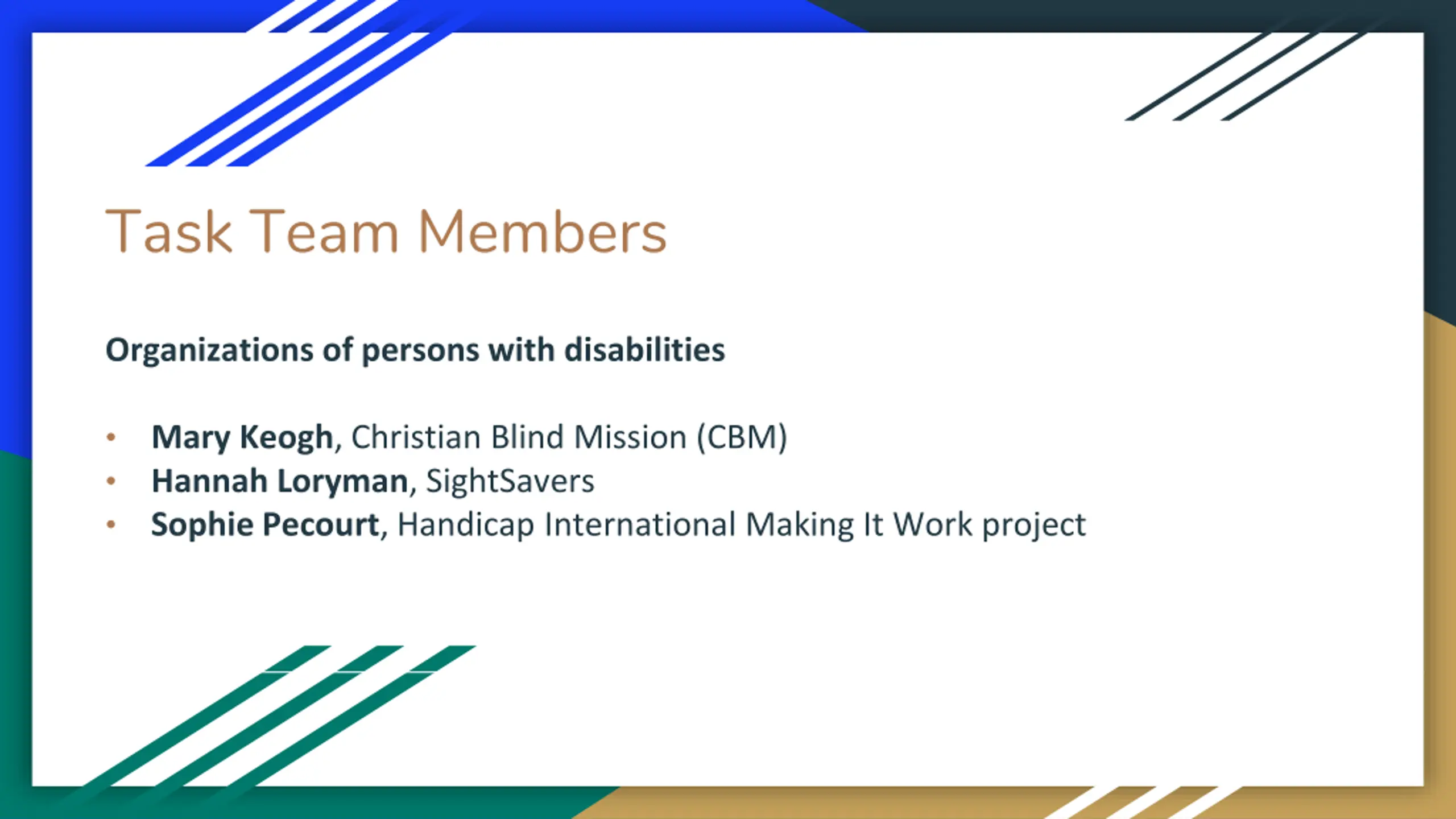 Task Team Members Organizations of persons with disabilities Mary Keogh, Christian Blind Mission (CBM) Hannah Loryman, SightSavers Sophie Pecourt, Handicap International Making It Work project