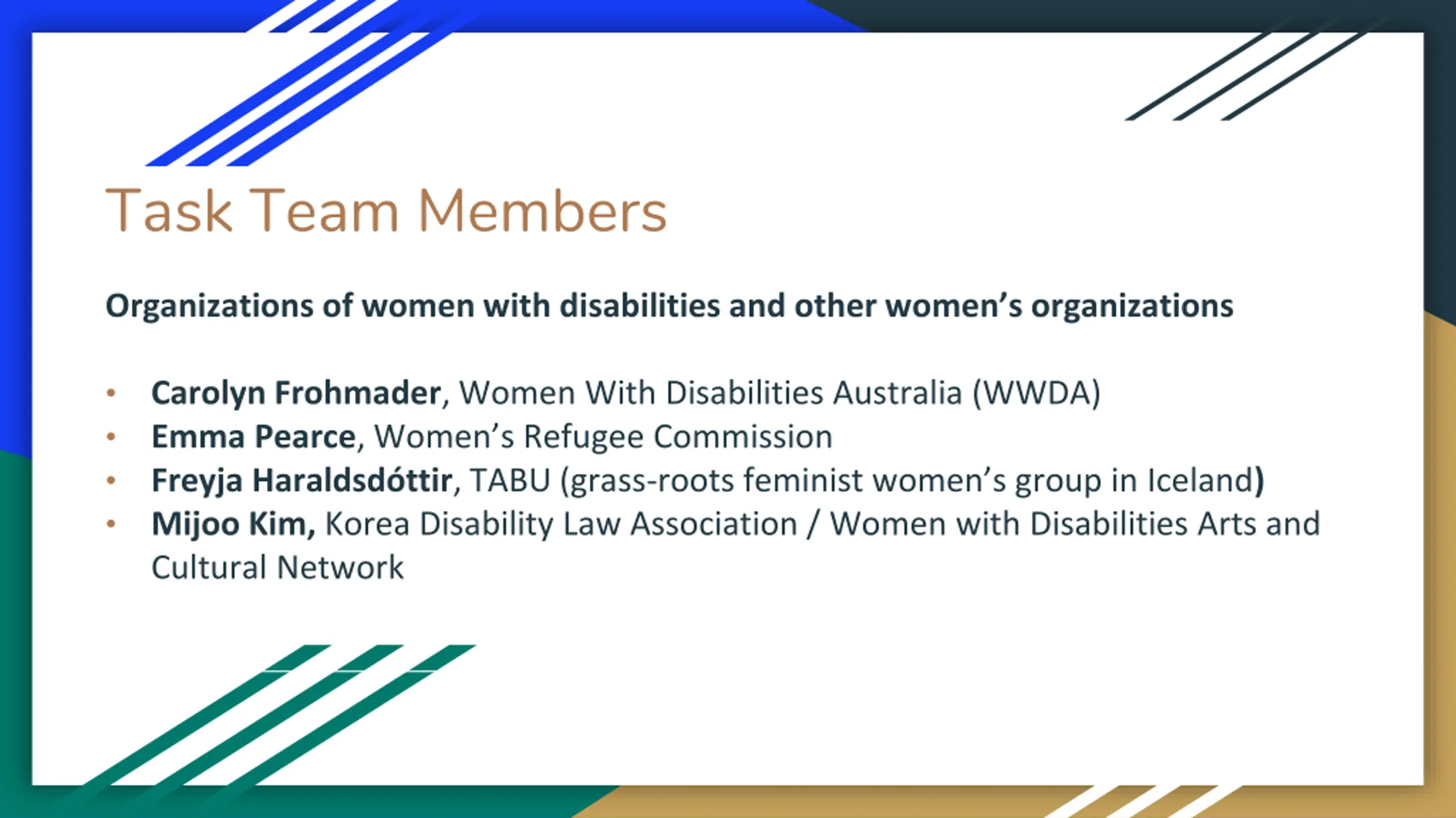 Task Team Members Organizations of women with disabilities and other women s organizations Carolyn Frohmader, Women With Disabilities Australia (WWDA) Emma Pearce, Women s Refugee Commission Freyja Haraldsd ttir, TABU (grass-roots feminist women s group in Iceland) Mijoo Kim, Korea Disability Law Association / Women with Disabilities Arts and Cultural Network
