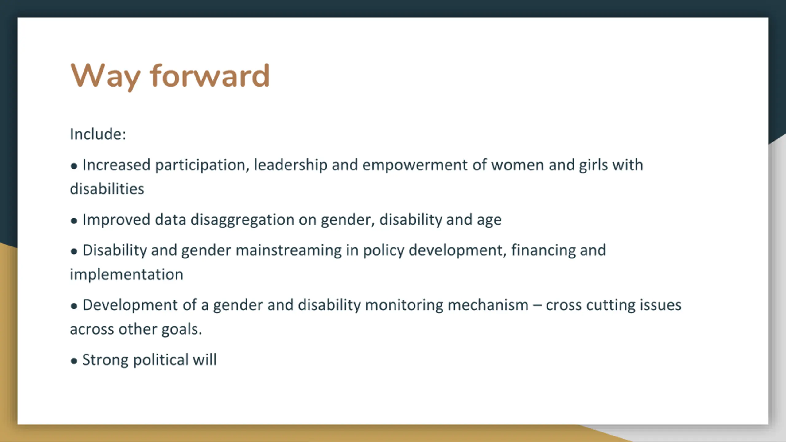 Way forward Include: Increased participation, leadership and empowerment of women and girls with disabilities Improved data disaggregation on gender, disability and age Disability and gender mainstreaming in policy development, financing and implementation Development of a gender and disability monitoring mechanism cross cutting issues across other goals. Strong political will