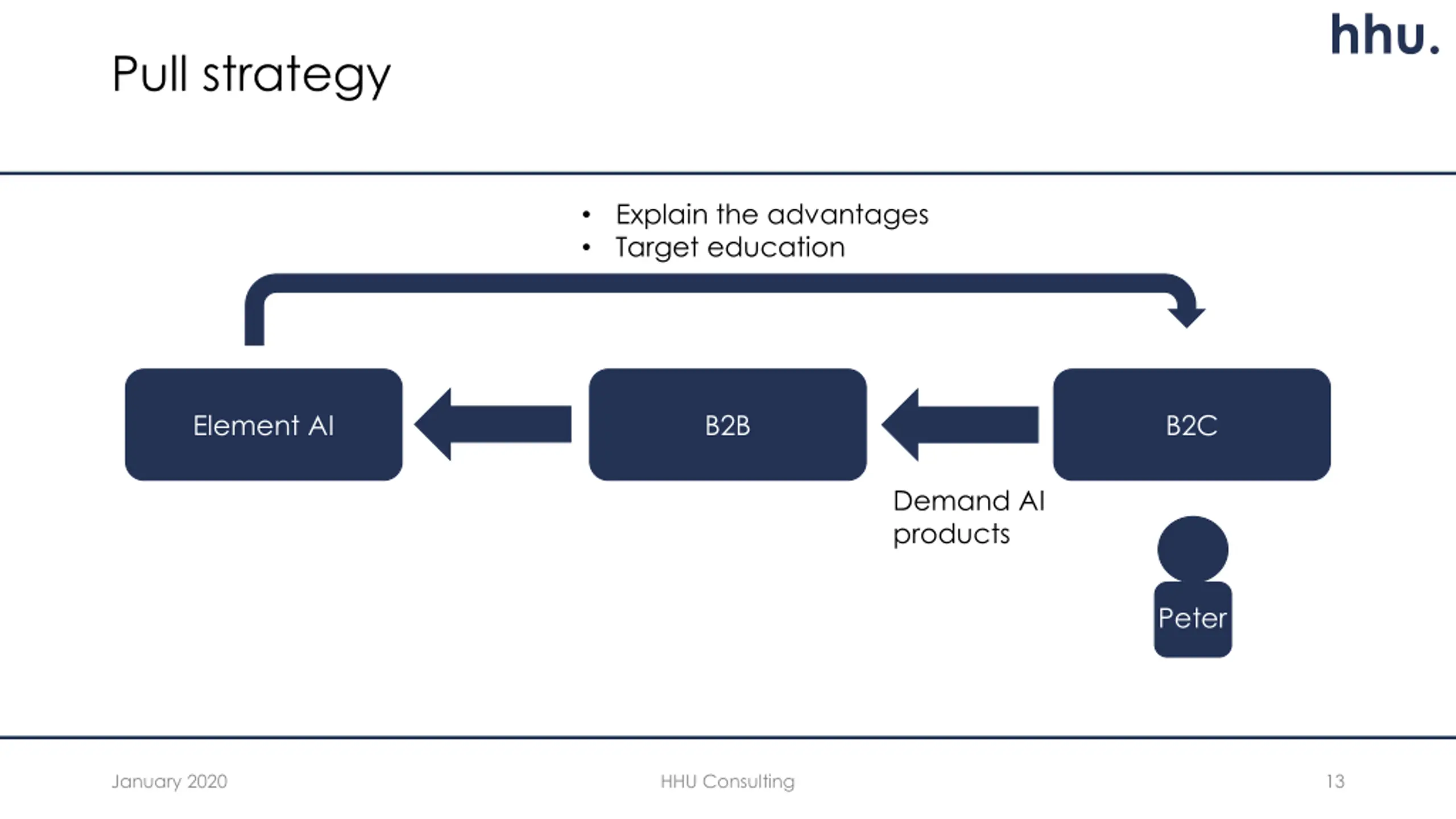 hhu. Pull strategy Explain the advantages Target education Element AI B2B B2C Demand AI products Peter January 2020 HHU Consulting 13
