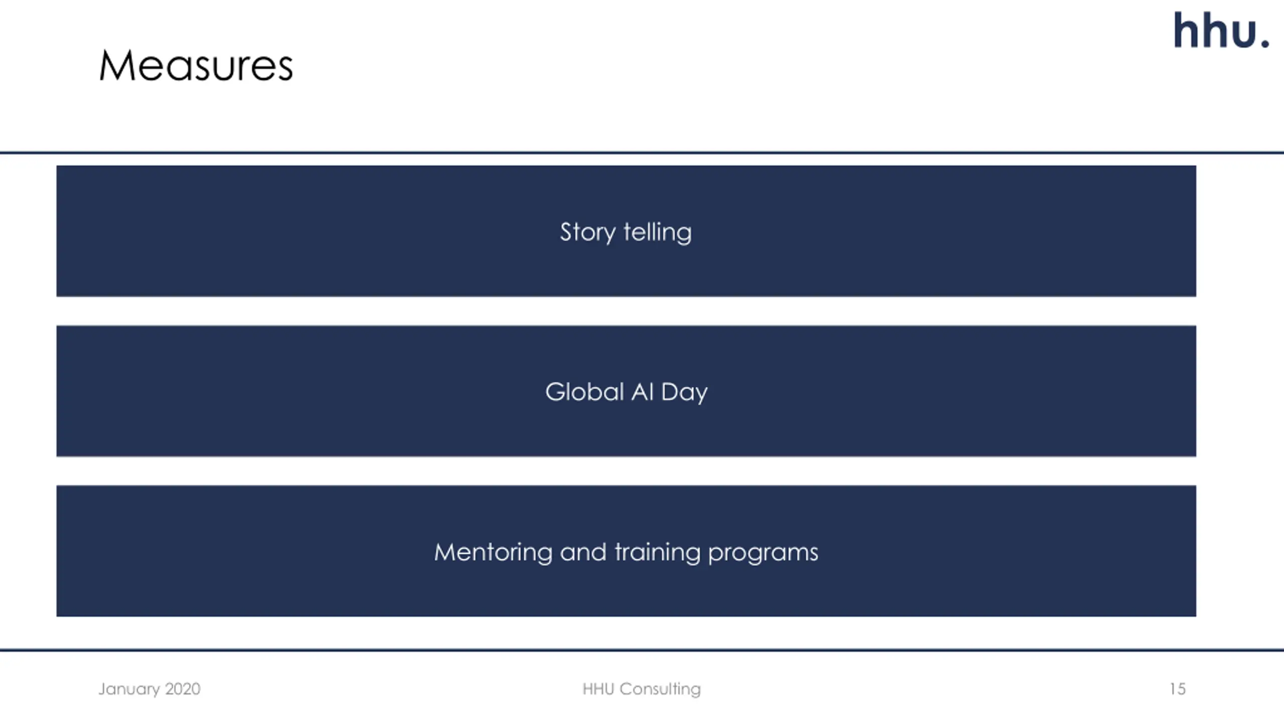 hhu. Measures Story telling Global AI Day Mentoring and training programs January 2020 HHU Consulting 15