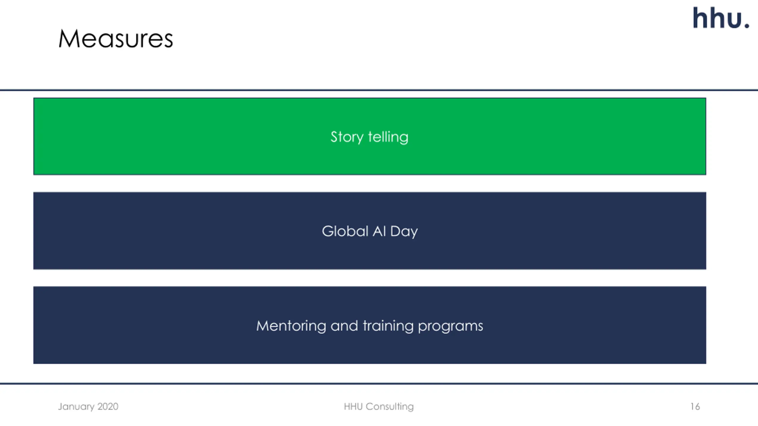hhu. Measures Story telling Global AI Day Mentoring and training programs January 2020 HHU Consulting 16