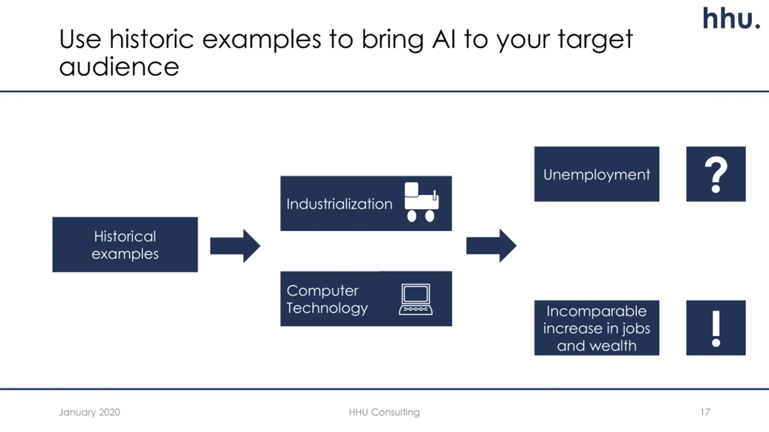 hhu. Use historic examples to bring AI to your target audience ? Unemployment Industrialization Historical examples Technology Computer ! Incomparable increase in jobs and wealth January 2020 HHU Consulting 17