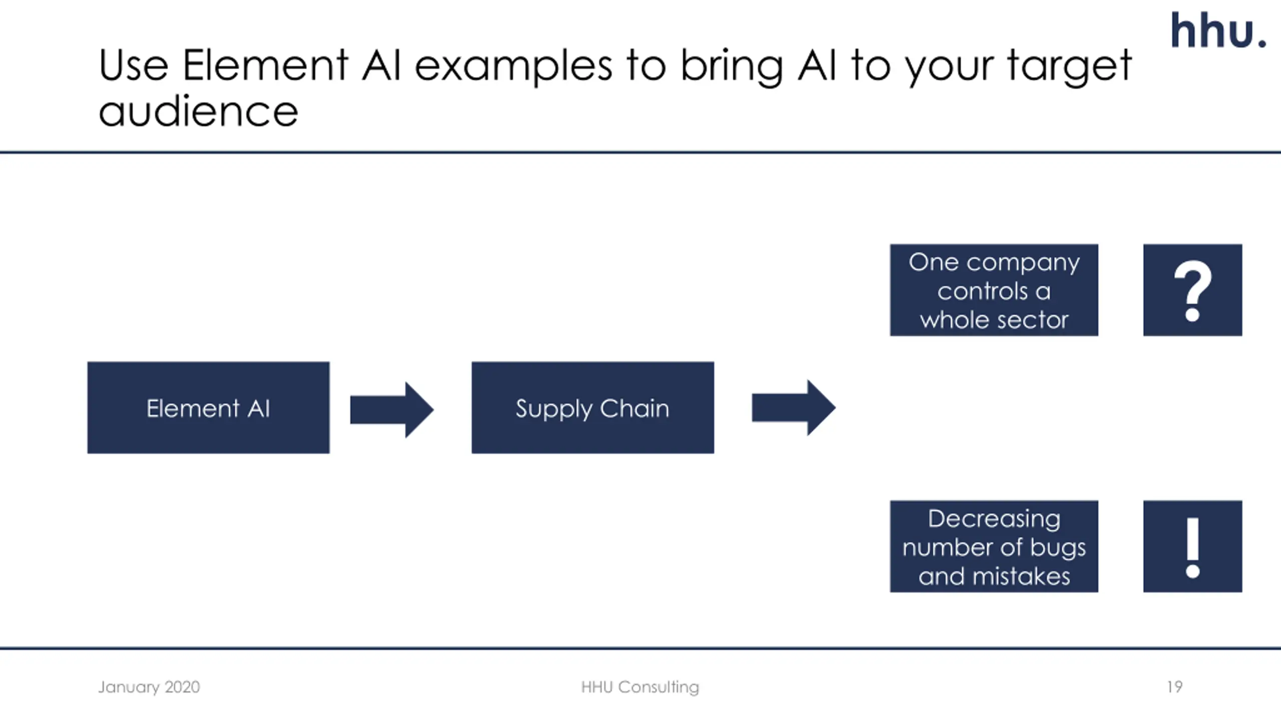 hhu. Use Element AI examples to bring AI to your target audience ? One company controls a whole sector Element AI Supply Chain ! Decreasing number of bugs and mistakes January 2020 HHU Consulting 19