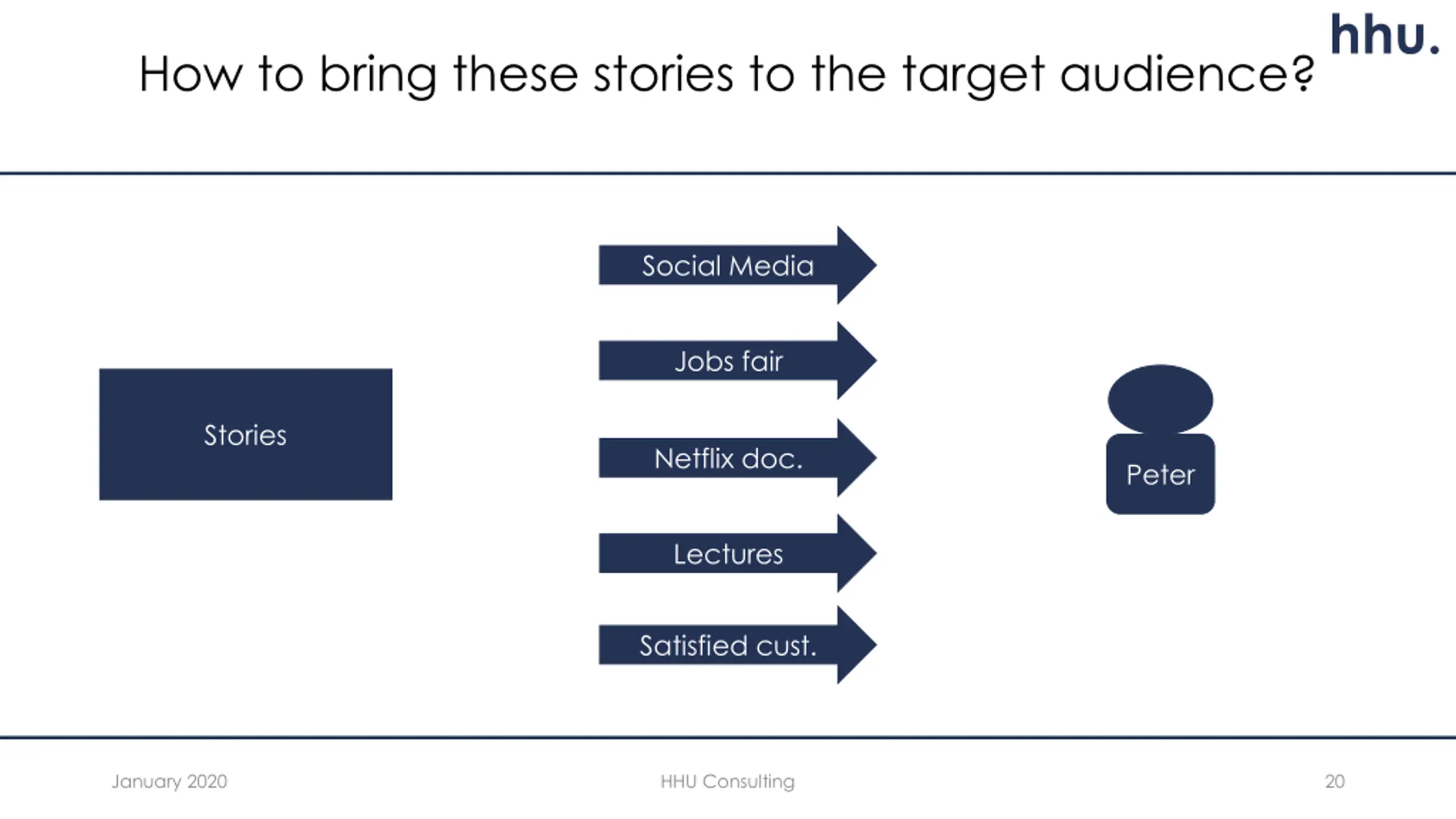 hhu. How to bring these stories to the target audience? Social Media Jobs fair Stories Netflix doc. Peter Lectures Satisfied cust. January 2020 HHU Consulting 20