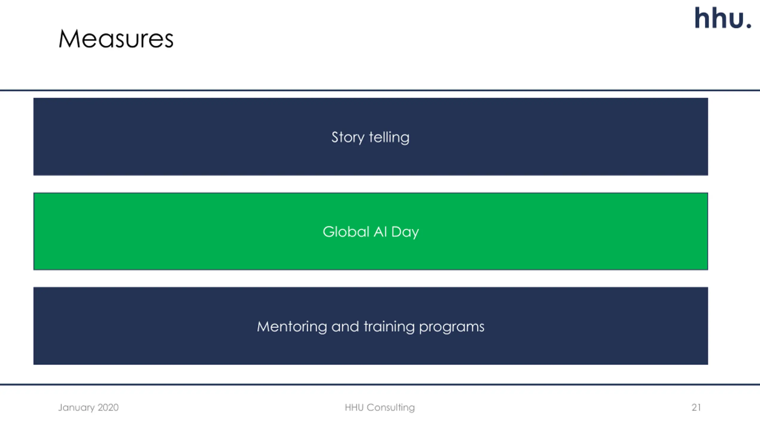 hhu. Measures Story telling Global AI Day Mentoring and training programs January 2020 HHU Consulting 21
