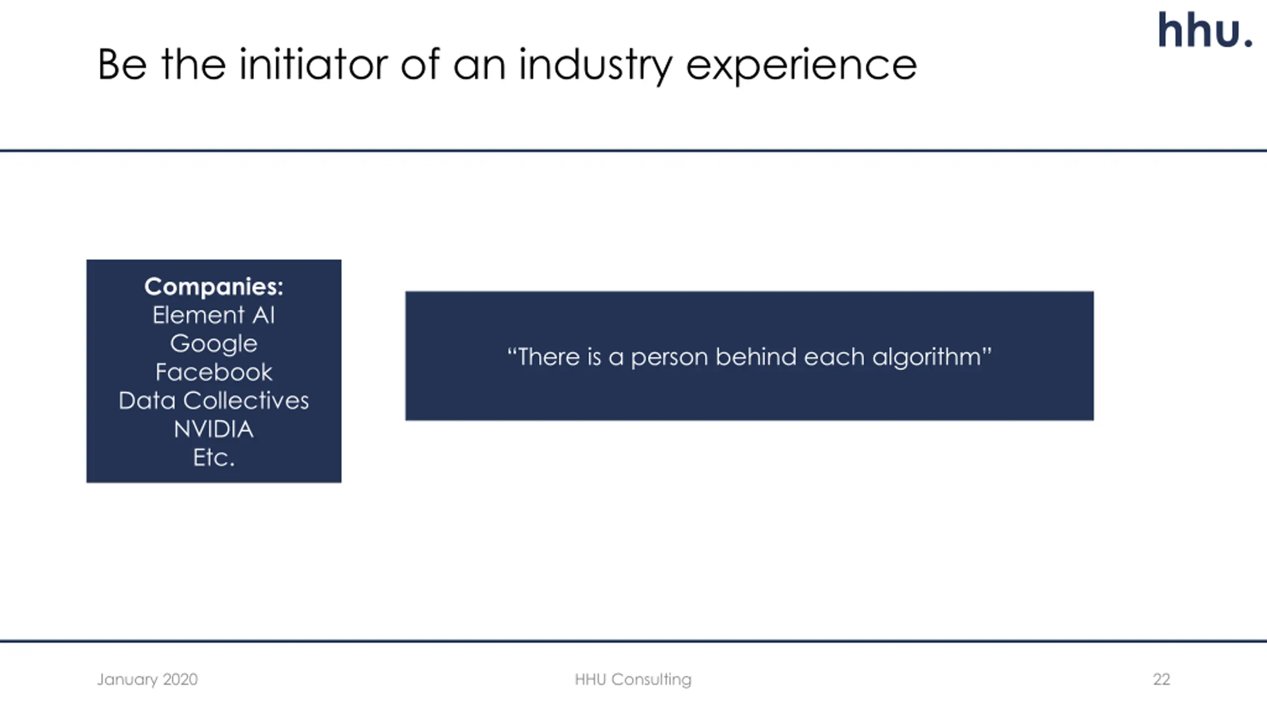 hhu. Be the initiator of an industry experience Companies: Element AI Google Facebook Data Collectives NVIDIA Etc. There is a person behind each algorithm January 2020 HHU Consulting 22
