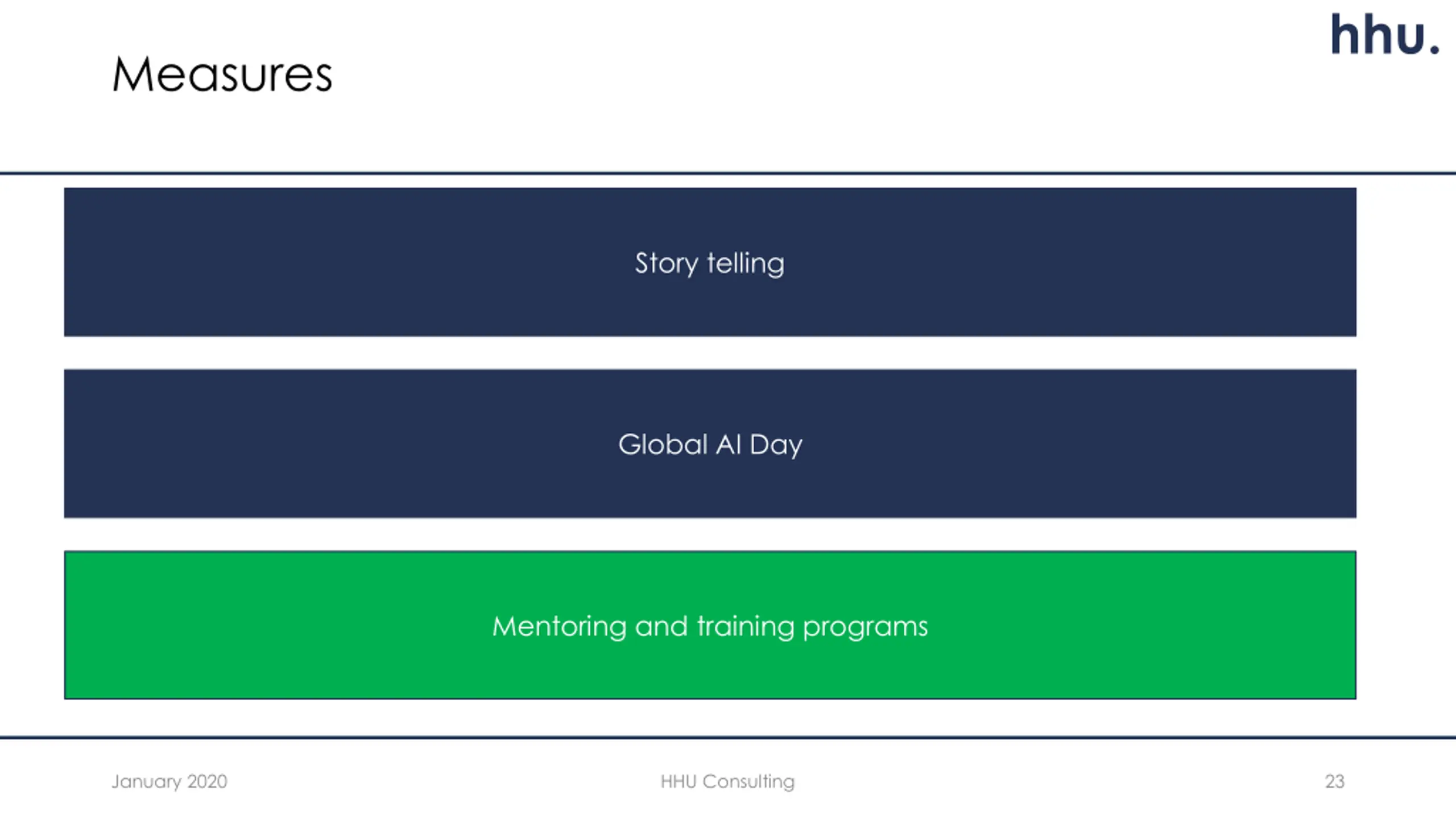 hhu. Measures Story telling Global AI Day Mentoring and training programs January 2020 HHU Consulting 23