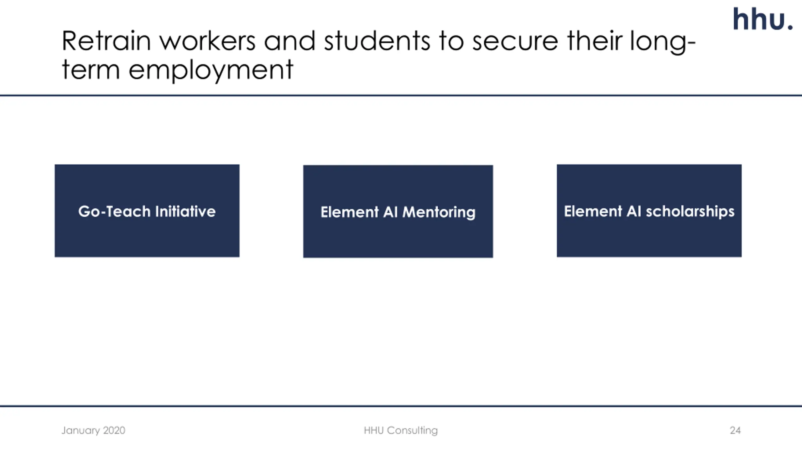 hhu. Retrain workers and students to secure their long- term employment Element AI scholarships Go-Teach Initiative Element AI Mentoring January 2020 HHU Consulting 24
