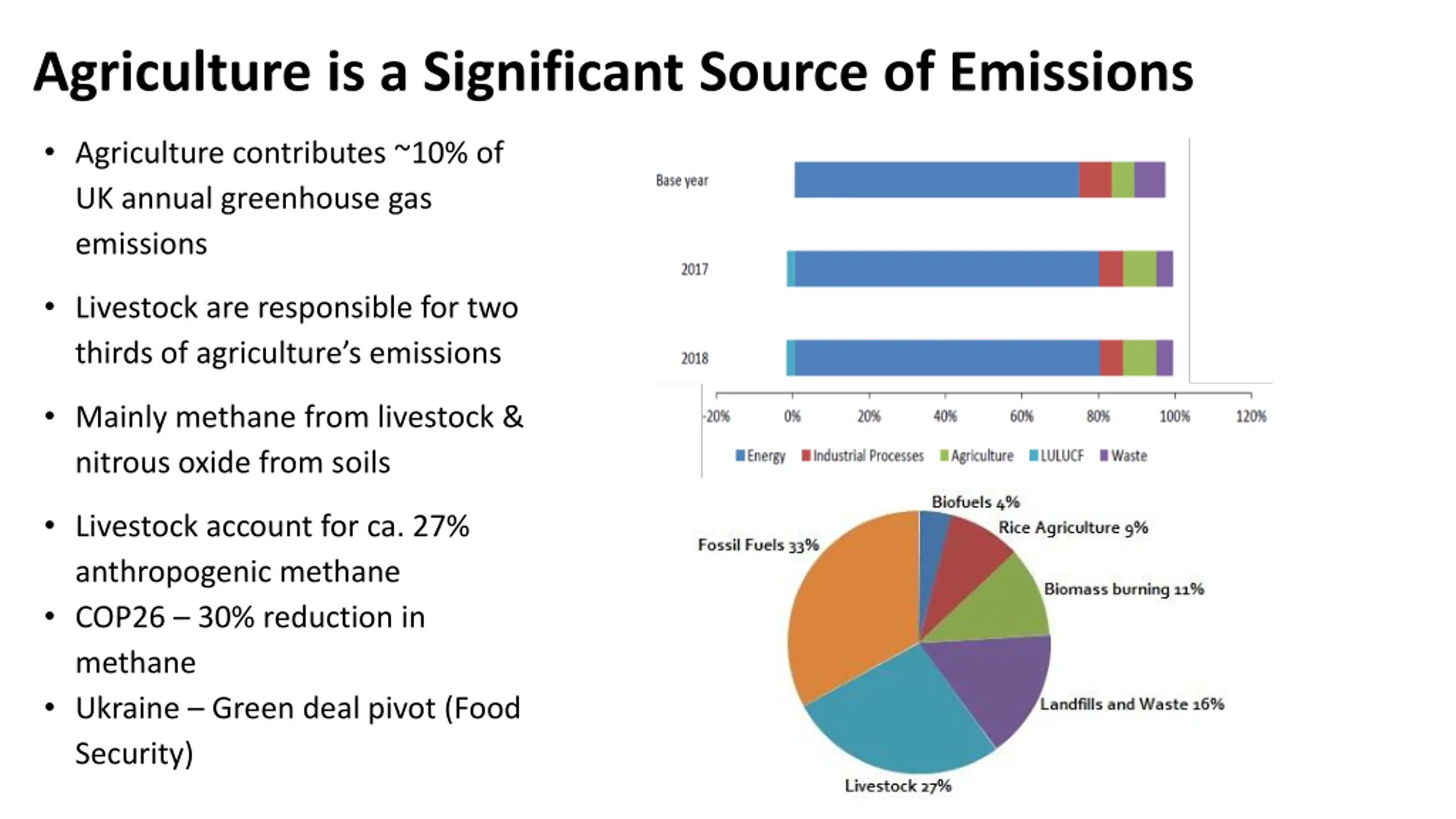 Agriculture is a Significant Source of Emissions Agriculture contributes ~10% of UK annual greenhouse gas emissions Livestock are responsible for two thirds of agriculture s emissions Mainly methane from livestock & nitrous oxide from soils Livestock account for ca. 27% anthropogenic methane COP26 30% reduction in methane Ukraine Green deal pivot (Food Security)