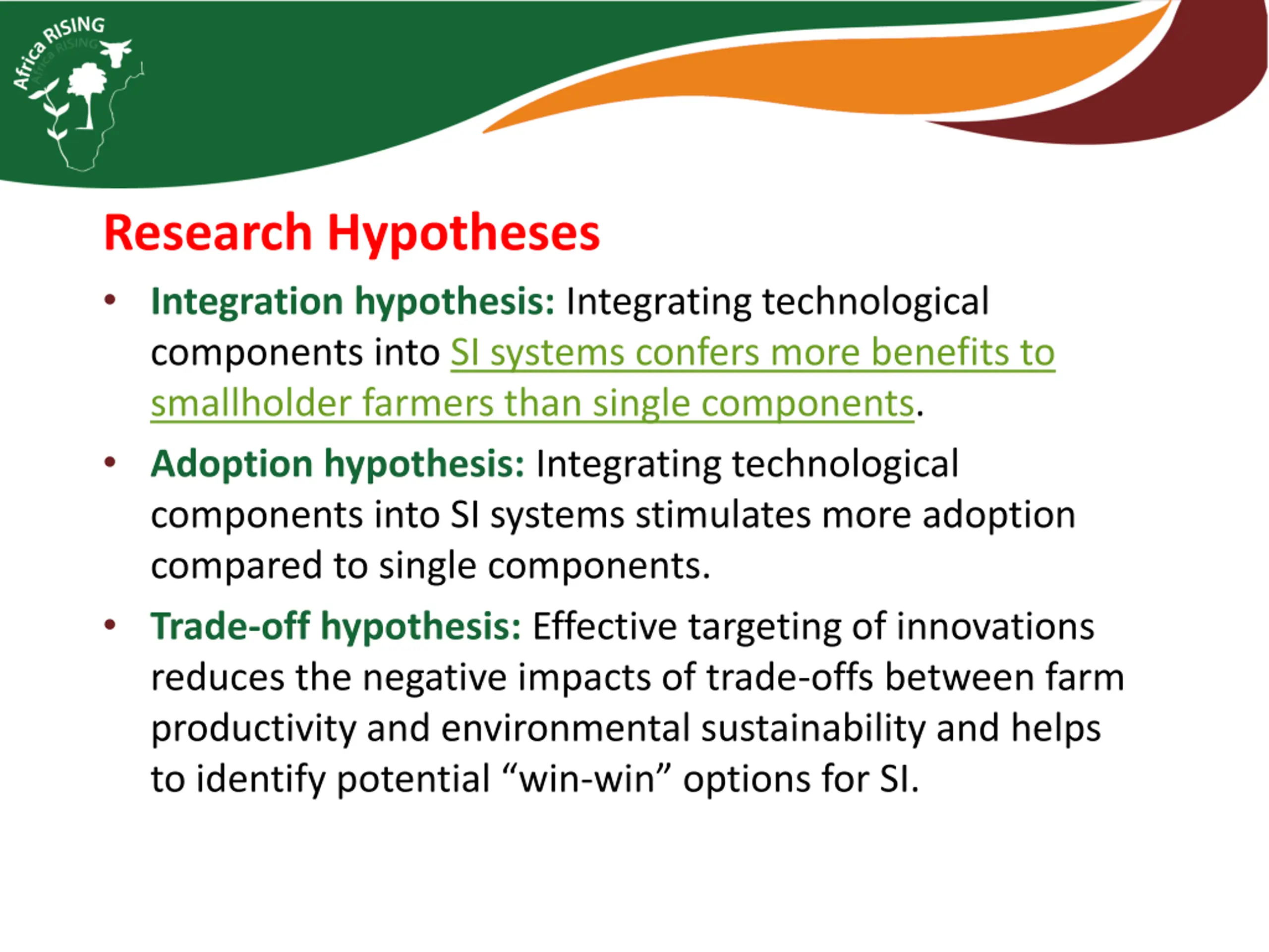 Research Hypotheses Integration hypothesis: Integrating technological components into SI systems confers more benefits to smallholder farmers than single components. Adoption hypothesis: Integrating technological components into SI systems stimulates more adoption compared to single components. Trade-off hypothesis: Effective targeting of innovations reduces the negative impacts of trade-offs between farm productivity and environmental sustainability and helps to identify potential win-win options for SI.