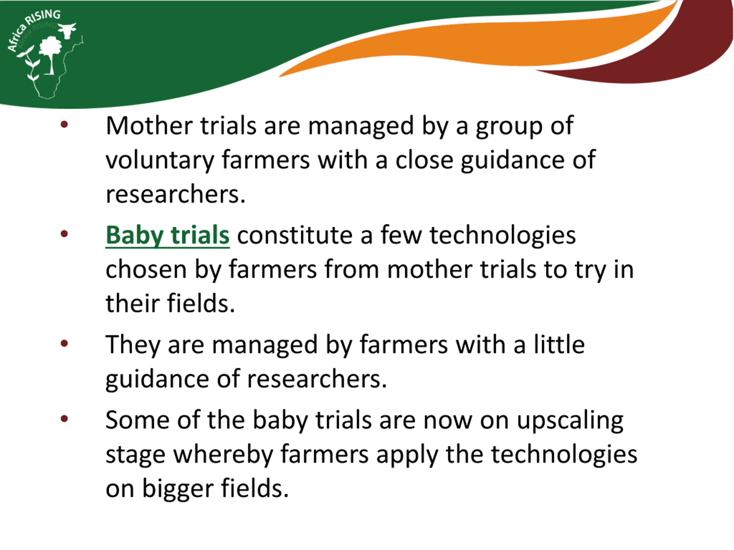 Mother trials are managed by a group of voluntary farmers with a close guidance of researchers. Baby trials constitute a few technologies chosen by farmers from mother trials to try in their fields. They are managed by farmers with a little guidance of researchers. Some of the baby trials are now on upscaling stage whereby farmers apply the technologies on bigger fields.