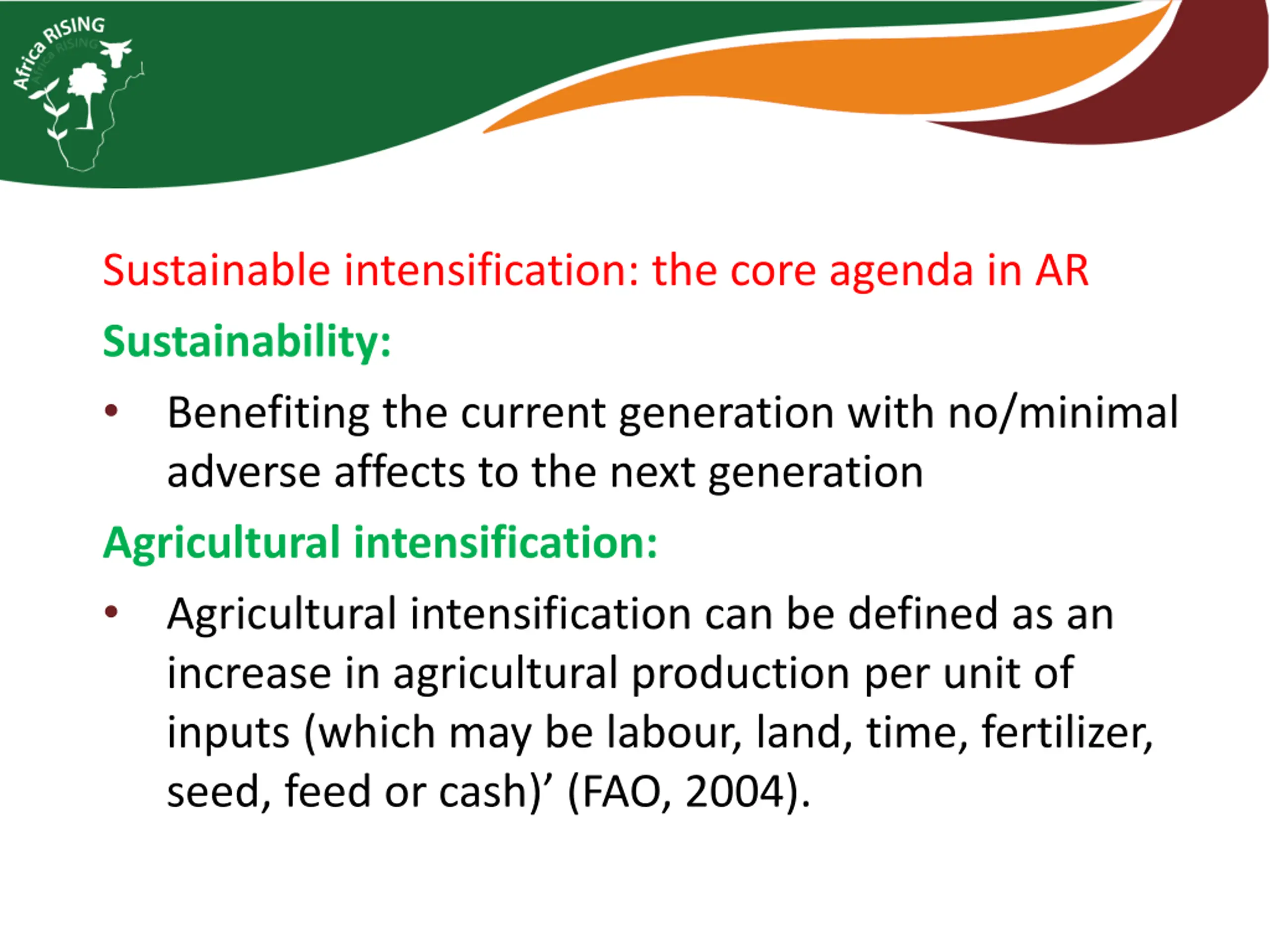 Sustainable intensification: the core agenda in AR Sustainability: Benefiting the current generation with no/minimal adverse affects to the next generation Agricultural intensification: Agricultural intensification can be defined as an increase in agricultural production per unit of inputs (which may be labour, land, time, fertilizer, seed, feed or cash) (FAO, 2004).
