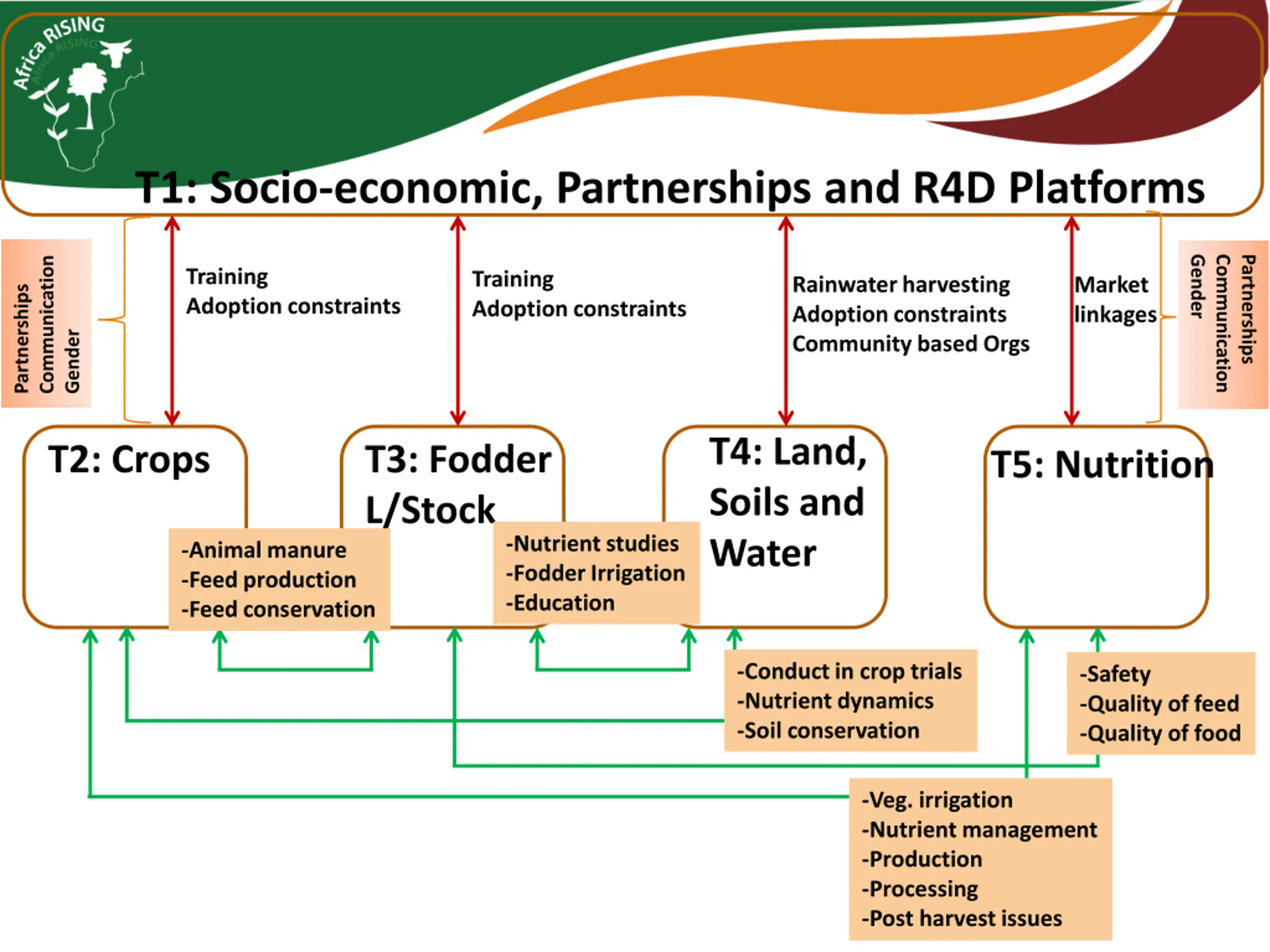 T1: Socio-economic, Partnerships and R4D Platforms Gender Communication Partnerships Communication Training Adoption constraints Training Adoption constraints Rainwater harvesting Adoption constraints Community based Orgs Market linkages Partnerships Gender T4: Land, Soils and Water T2: Crops T3: Fodder L/Stock T5: Nutrition -Nutrient studies -Fodder Irrigation -Education -Animal manure -Feed production -Feed conservation -Conduct in crop trials -Nutrient dynamics -Soil conservation -Safety -Quality of feed -Quality of food -Veg. irrigation -Nutrient management -Production -Processing -Post harvest issues