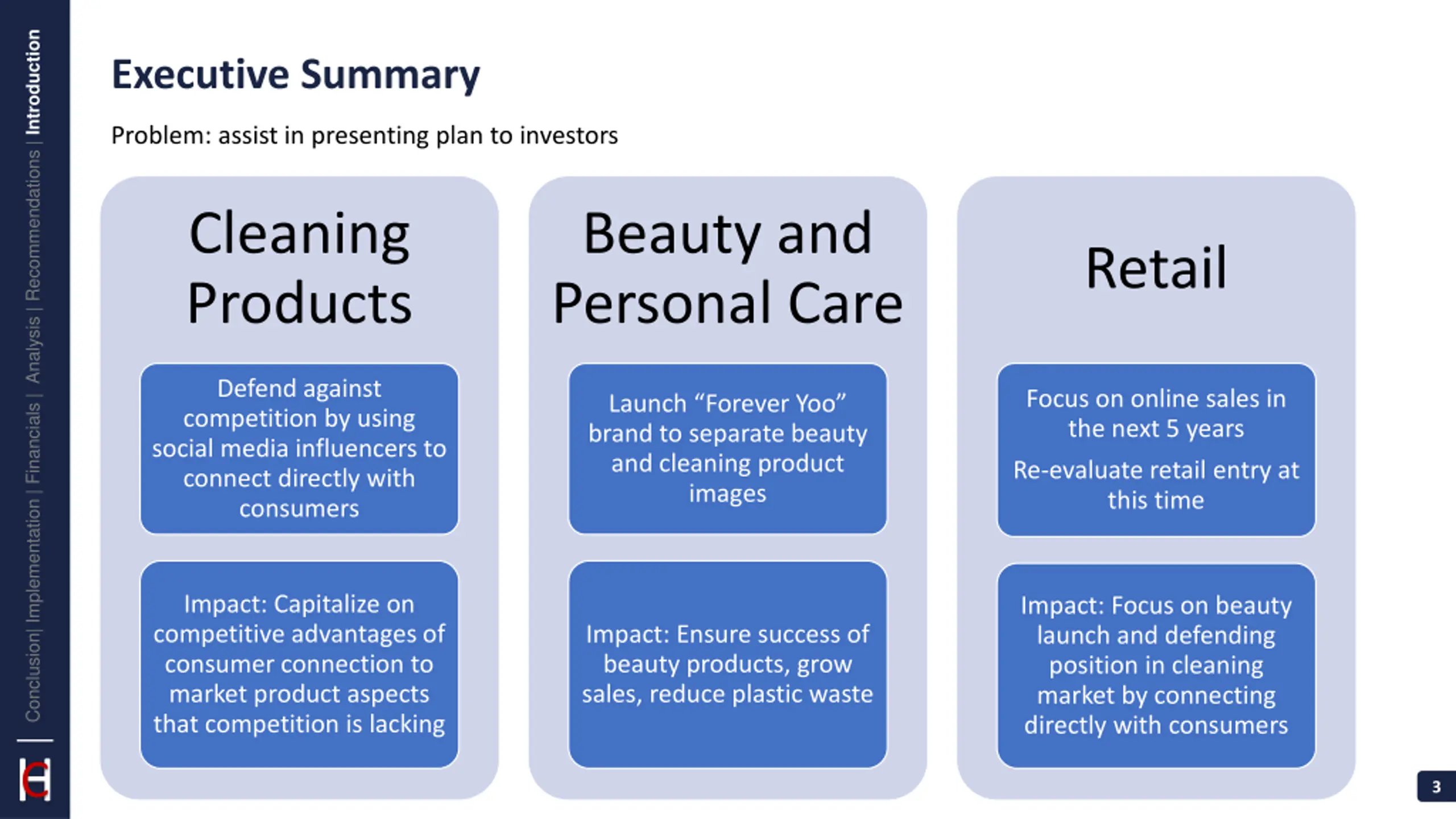 Conclusion| Implementation | Financials | Analysis | Recommendations | Introduction Executive Summary Problem: assist in presenting plan to investors Cleaning Products Beauty and Personal Care Retail Defend against competition by using social media influencers to connect directly with consumers Focus on online sales in the next 5 years Launch Forever Yoo brand to separate beauty and cleaning product images Re-evaluate retail entry at this time Impact: Capitalize on competitive advantages of consumer connection to market product aspects that competition is lacking Impact: Focus on beauty launch and defending position in cleaning market by connecting directly with consumers Impact: Ensure success of beauty products, grow sales, reduce plastic waste H C 3