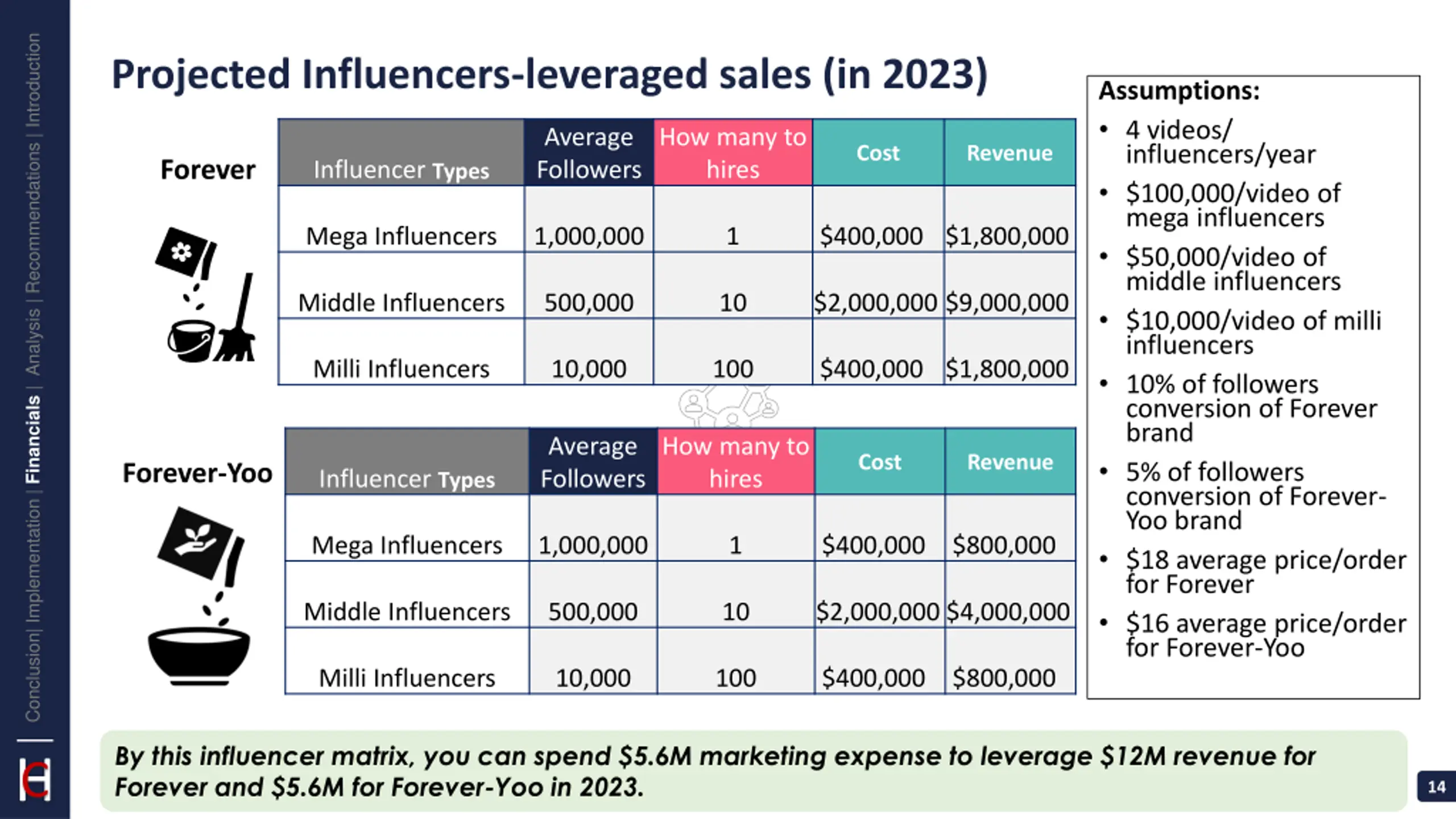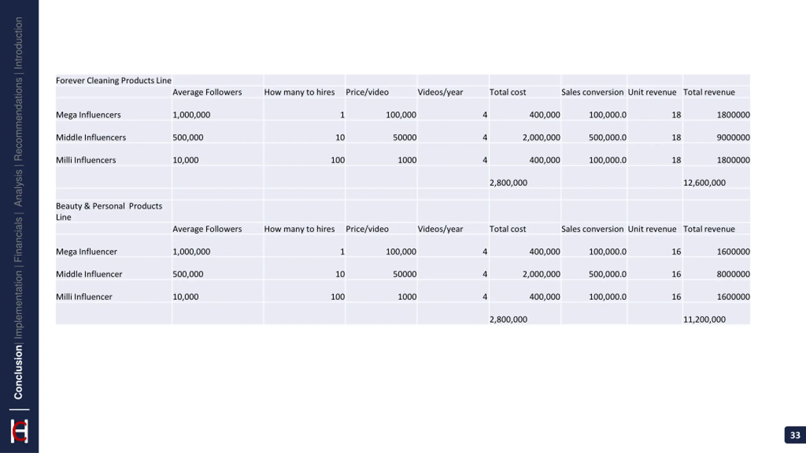 Conclusion| Implementation | Financials | Analysis | Recommendations | Introduction Forever Cleaning Products Line Average Followers How many to hires Price/video Videos/year Total cost Sales conversion Unit revenue Total revenue Mega Influencers 1,000,000 1 100,000 4 400,000 100,000.0 18 1800000 Middle Influencers 500,000 10 50000 4 2,000,000 500,000.0 18 9000000 Milli Influencers 10,000 100 1000 4 400,000 100,000.0 18 1800000 2,800,000 12,600,000 Beauty & Personal Products Line Average Followers How many to hires Price/video Videos/year Total cost Sales conversion Unit revenue Total revenue Mega Influencer 1,000,000 1 100,000 4 400,000 100,000.0 16 1600000 Middle Influencer 500,000 10 50000 4 2,000,000 500,000.0 16 8000000 Milli Influencer 10,000 100 1000 4 400,000 100,000.0 16 1600000 2,800,000 11,200,000 H C 33
