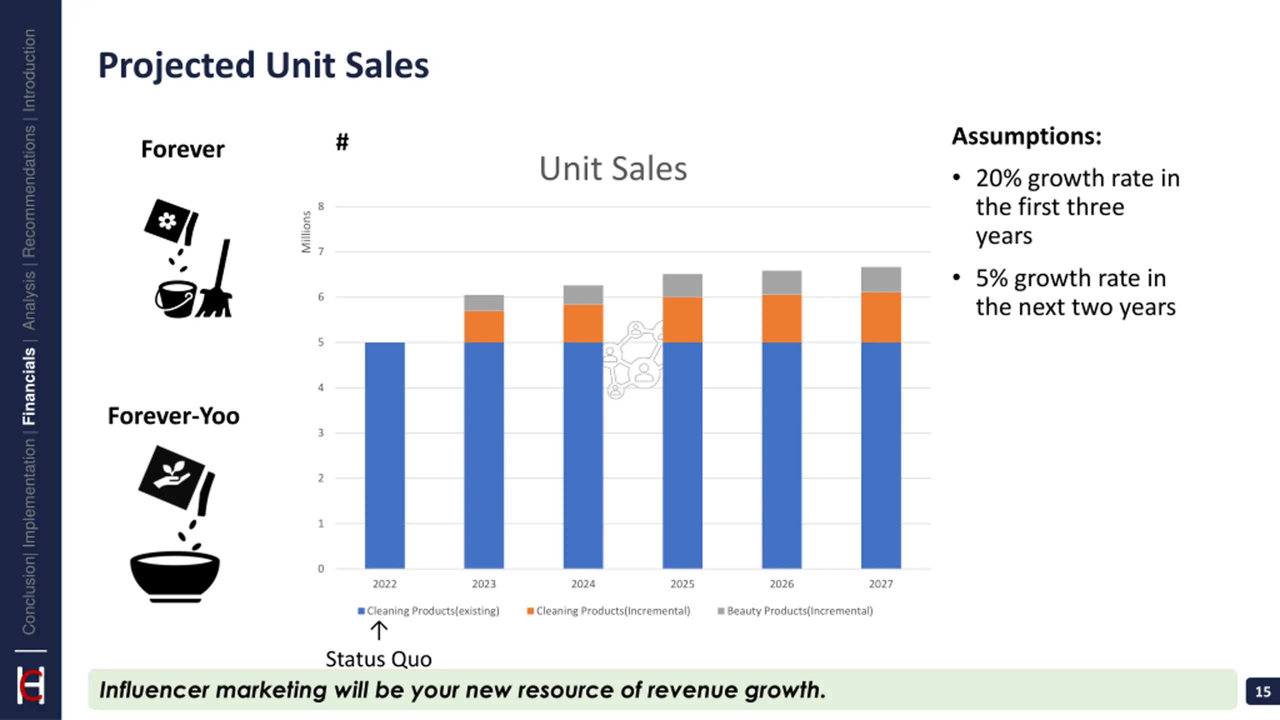 Conclusion| Implementation | Financials | Analysis | Recommendations | Introduction Projected Unit Sales Assumptions: 20% growth rate in the first three years 5% growth rate in the next two years # Forever Unit Sales 8 Millions 7 6 5 4 Forever-Yoo 3 2 1 0 2022 2023 2024 2025 2026 2027 Cleaning Products(existing) Status Quo Cleaning Products(Incremental) Beauty Products(Incremental) H C Influencer marketing will be your new resource of revenue growth. 15