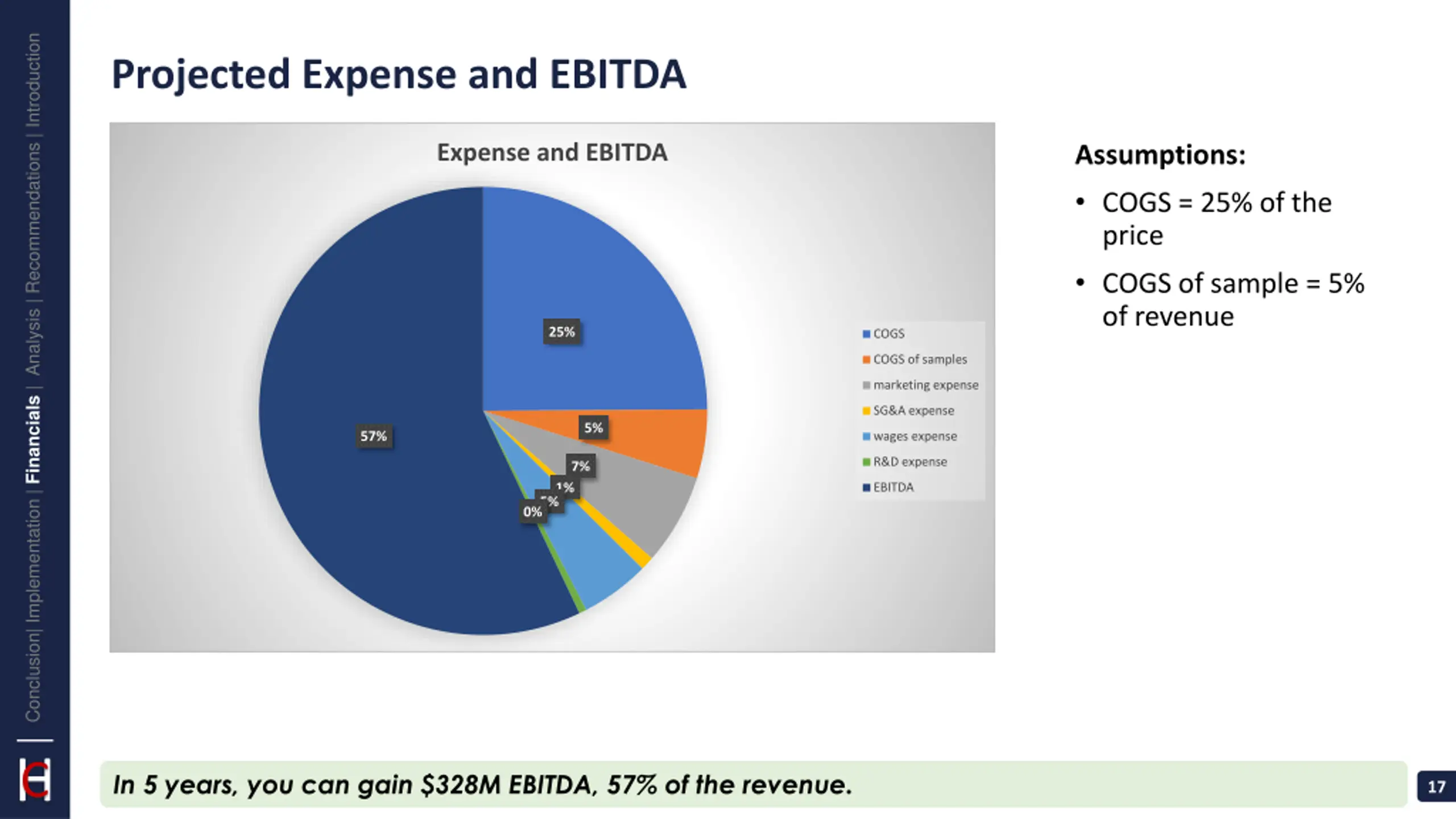 Conclusion| Implementation | Financials | Analysis | Recommendations | Introduction Projected Expense and EBITDA Expense and EBITDA Assumptions: COGS = 25% of the price COGS of sample = 5% of revenue 25% COGS COGS of samples marketing expense SG&A expense 5% 57% wages expense R&D expense 7% 1% EBITDA 5% 0% H C In 5 years, you can gain $328M EBITDA, 57% of the revenue. 17