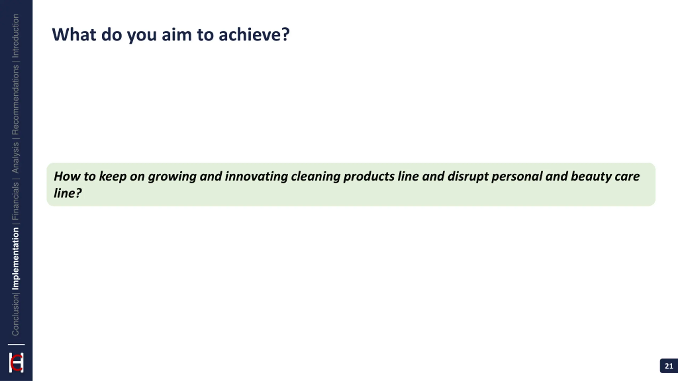 Conclusion| Implementation | Financials | Analysis | Recommendations | Introduction What do you aim to achieve? How to keep on growing and innovating cleaning products line and disrupt personal and beauty care line? H C 21