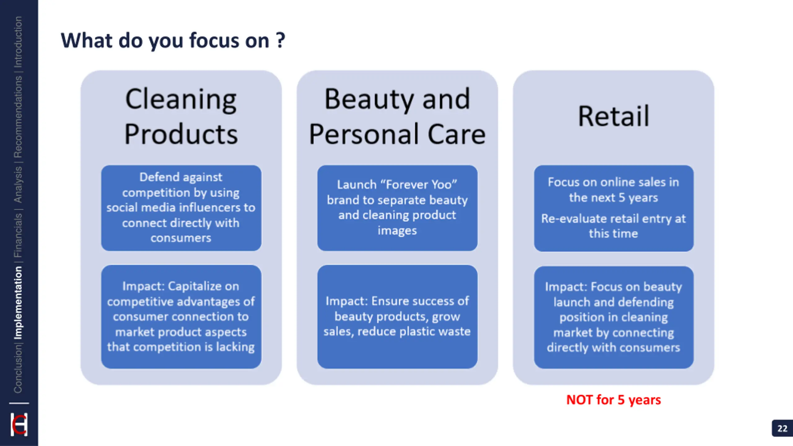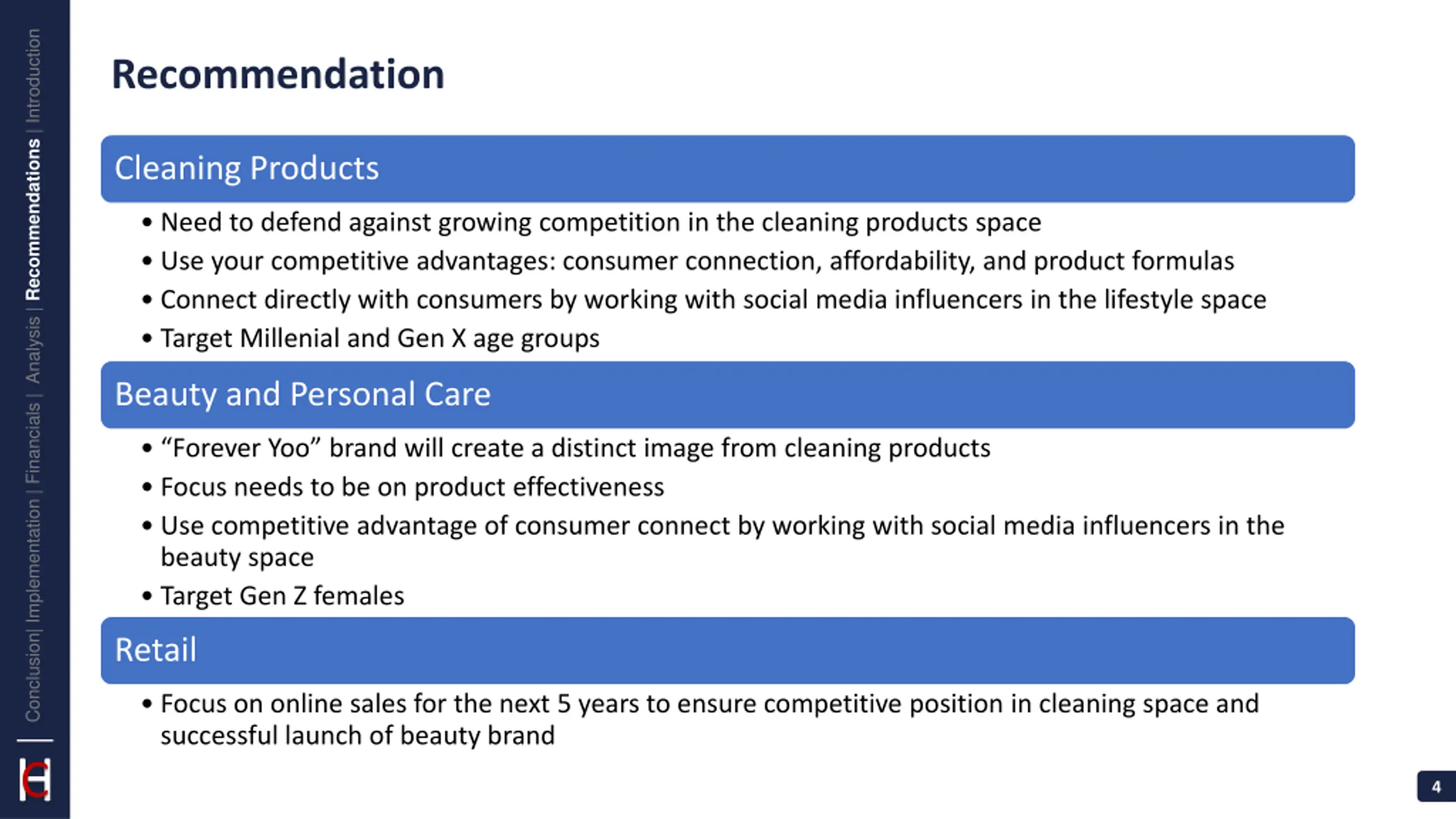 Conclusion| Implementation | Financials | Analysis | Recommendations | Introduction Recommendation Cleaning Products Need to defend against growing competition in the cleaning products space Use your competitive advantages: consumer connection, affordability, and product formulas Connect directly with consumers by working with social media influencers in the lifestyle space Target Millenial and Gen X age groups Beauty and Personal Care Forever Yoo brand will create a distinct image from cleaning products Focus needs to be on product effectiveness Use competitive advantage of consumer connect by working with social media influencers in the beauty space Target Gen Z females Retail Focus on online sales for the next 5 years to ensure competitive position in cleaning space and successful launch of beauty brand H C 4