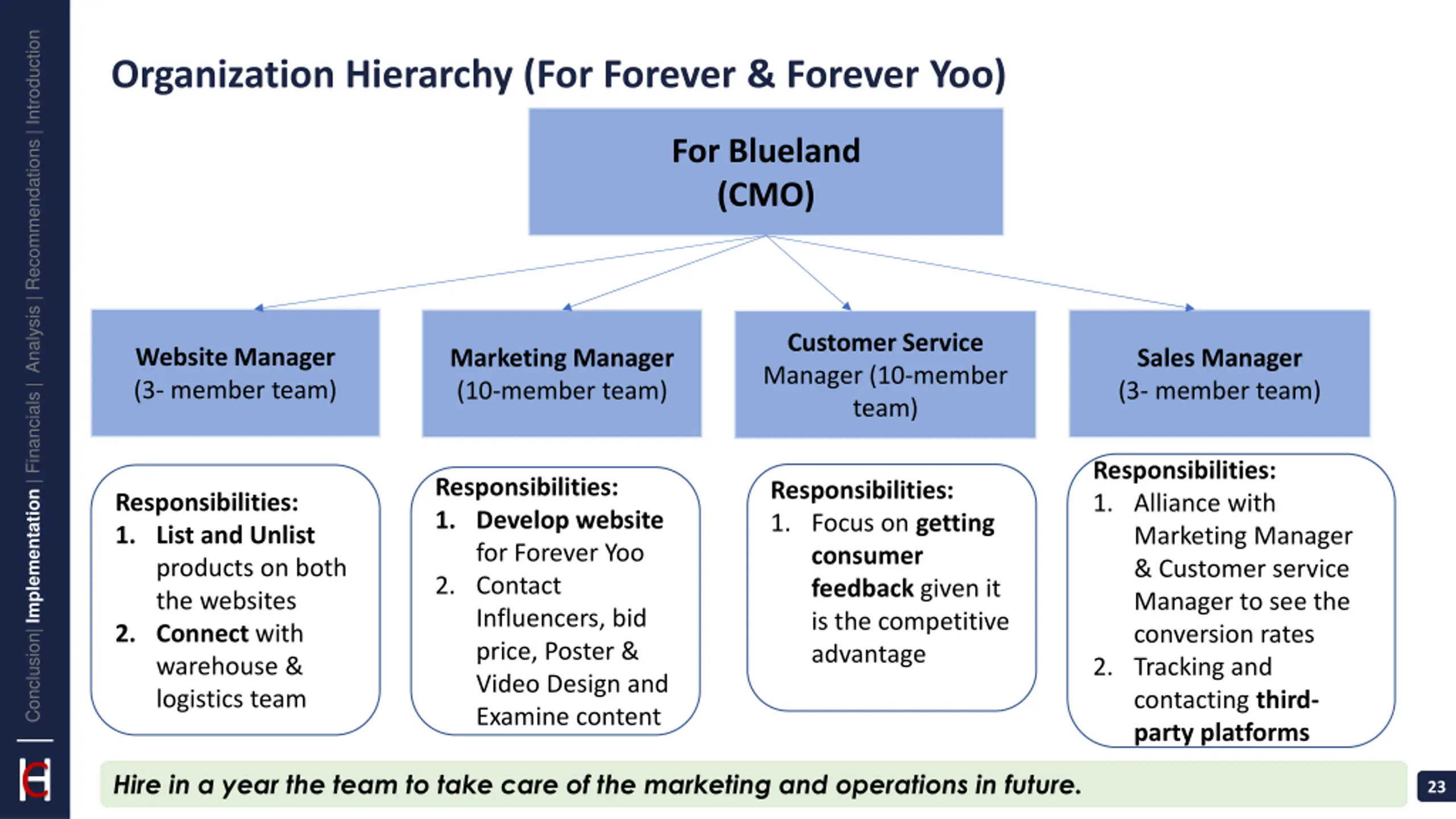 Conclusion| Implementation | Financials | Analysis | Recommendations | Introduction Organization Hierarchy (For Forever & Forever Yoo) For Blueland (CMO) Customer Service Manager (10-member team) Website Manager (3- member team) Marketing Manager (10-member team) Sales Manager (3- member team) Responsibilities: 1. Alliance with Marketing Manager & Customer service Manager to see the conversion rates 2. Tracking and contacting third- party platforms Responsibilities: 1. Develop website for Forever Yoo 2. Contact Influencers, bid price, Poster & Video Design and Examine content Responsibilities: 1. Focus on getting consumer feedback given it is the competitive advantage Responsibilities: 1. List and Unlist products on both the websites 2. Connect with warehouse & logistics team H C Hire in a year the team to take care of the marketing and operations in future. 23