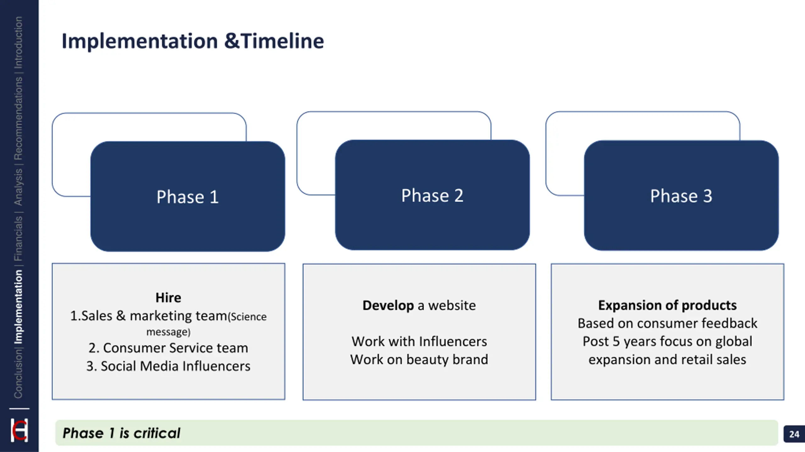 Conclusion| Implementation | Financials | Analysis | Recommendations | Introduction Implementation &Timeline Phase 2 Phase 3 Phase 1 Hire Expansion of products Based on consumer feedback Post 5 years focus on global expansion and retail sales Develop a website 1.Sales & marketing team(Science message) 2. Consumer Service team 3. Social Media Influencers Work with Influencers Work on beauty brand H C Phase 1 is critical 24