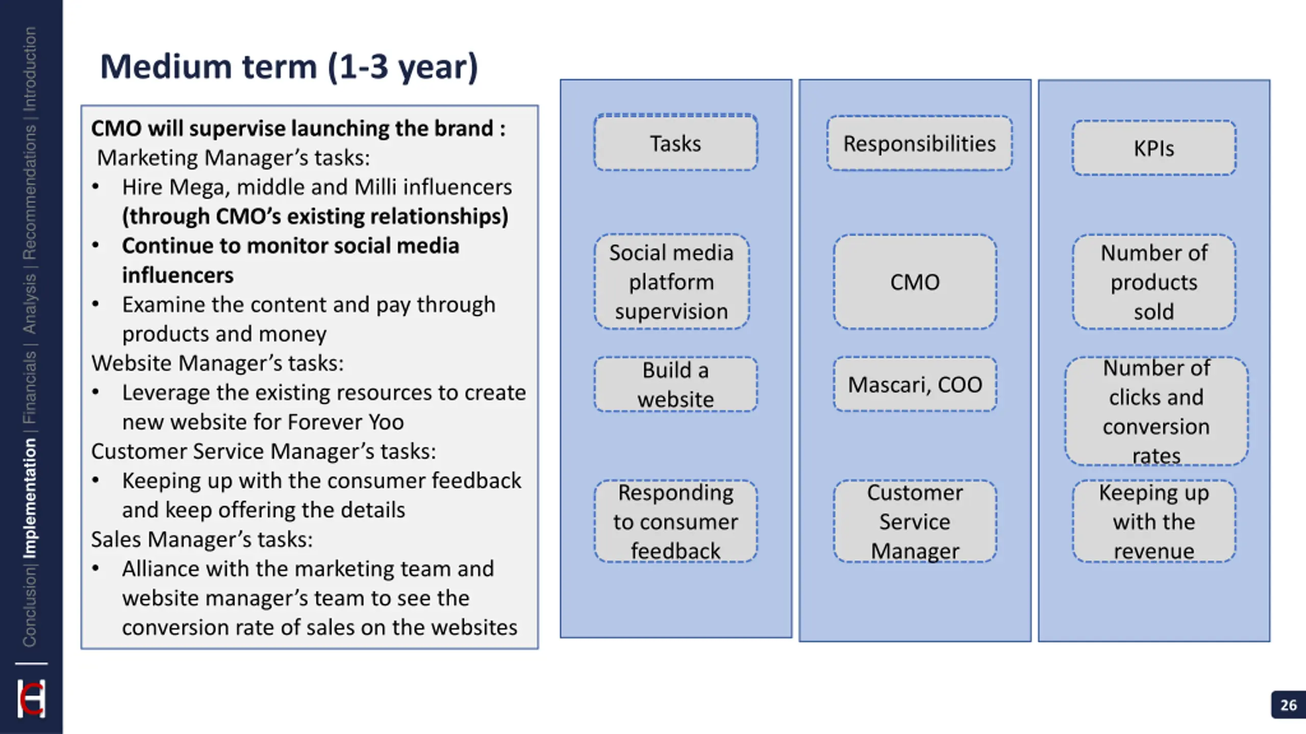 Conclusion| Implementation | Financials | Analysis | Recommendations | Introduction Medium term (1-3 year) CMO will supervise launching the brand : Marketing Manager s tasks: Hire Mega, middle and Milli influencers (through CMO s existing relationships) Continue to monitor social media influencers Examine the content and pay through products and money Website Manager s tasks: Leverage the existing resources to create new website for Forever Yoo Customer Service Manager s tasks: Keeping up with the consumer feedback and keep offering the details Sales Manager s tasks: Alliance with the marketing team and website manager s team to see the conversion rate of sales on the websites Tasks Responsibilities KPIs Social media platform supervision Number of products sold CMO Number of clicks and conversion rates Keeping up with the revenue Build a website Mascari, COO Responding to consumer feedback Customer Service Manager H C 26