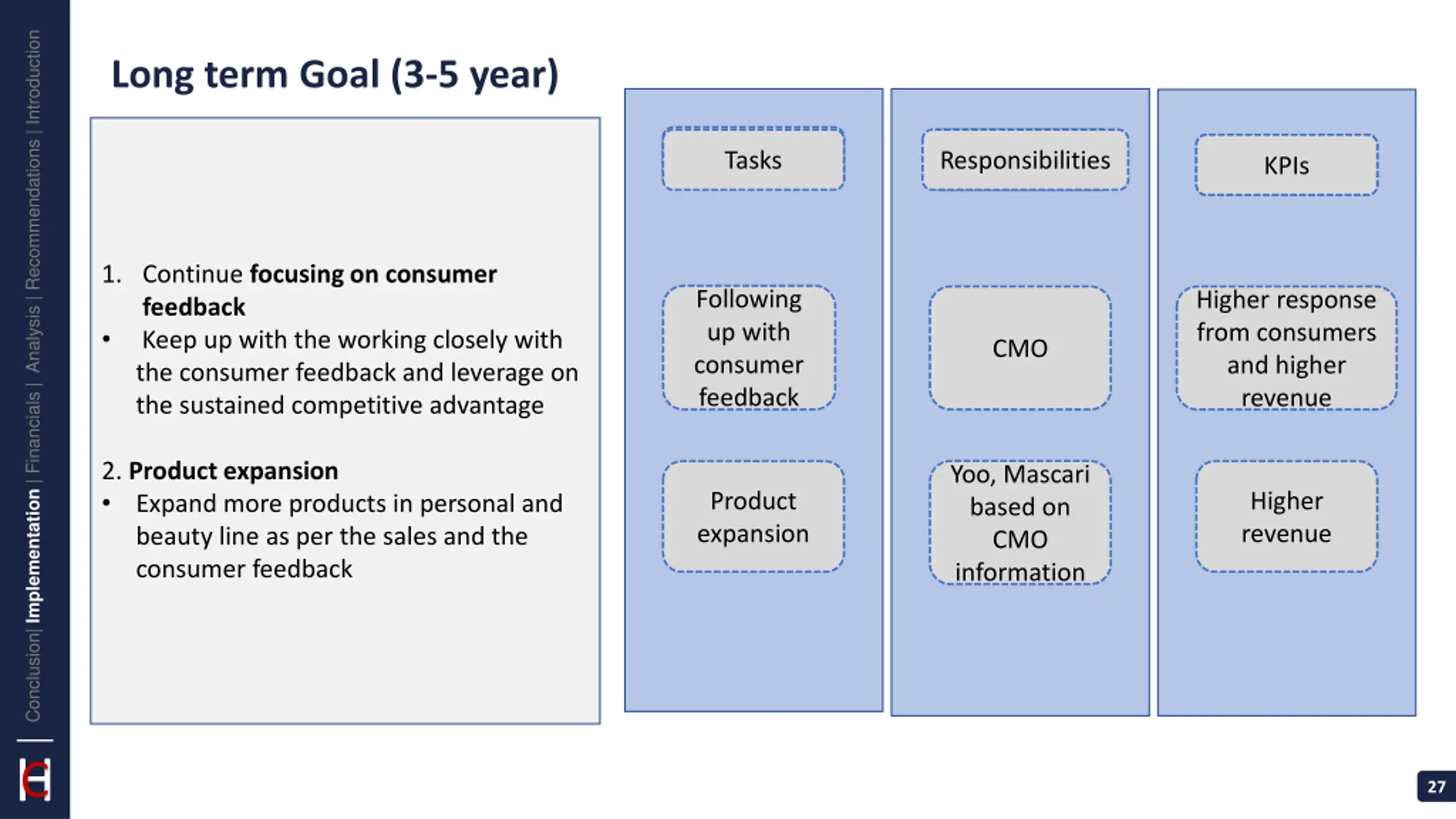 Conclusion| Implementation | Financials | Analysis | Recommendations | Introduction Long term Goal (3-5 year) Tasks Responsibilities KPIs 1. Continue focusing on consumer feedback Keep up with the working closely with the consumer feedback and leverage on the sustained competitive advantage Following up with consumer feedback Higher response from consumers and higher revenue CMO 2. Product expansion Expand more products in personal and beauty line as per the sales and the consumer feedback Yoo, Mascari based on CMO information Product expansion Higher revenue H C 27