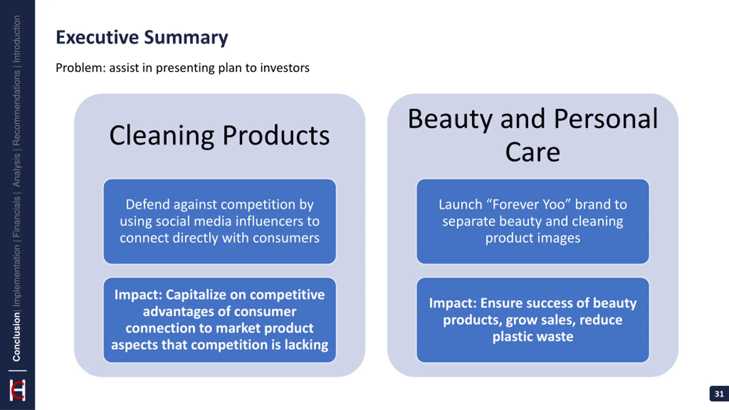 Conclusion| Implementation | Financials | Analysis | Recommendations | Introduction Executive Summary Problem: assist in presenting plan to investors Beauty and Personal Care Cleaning Products Defend against competition by using social media influencers to connect directly with consumers Launch Forever Yoo brand to separate beauty and cleaning product images Impact: Capitalize on competitive advantages of consumer connection to market product aspects that competition is lacking Impact: Ensure success of beauty products, grow sales, reduce plastic waste H C 31