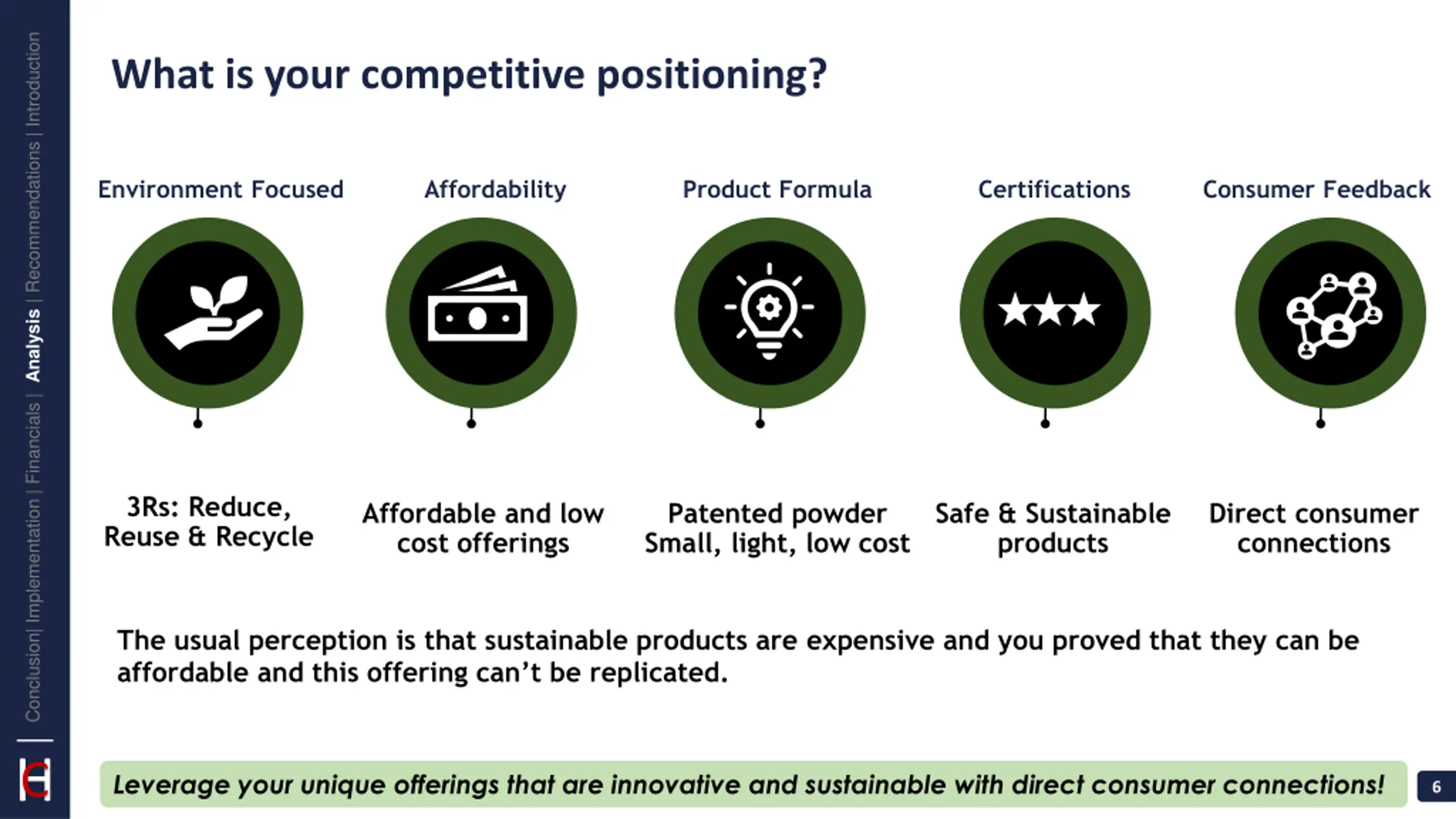Conclusion| Implementation | Financials | Analysis | Recommendations | Introduction What is your competitive positioning? Environment Focused Affordability Product Formula Certifications Consumer Feedback 3Rs: Reduce, Reuse & Recycle Affordable and low cost offerings Patented powder Small, light, low cost Safe & Sustainable products Direct consumer connections The usual perception is that sustainable products are expensive and you proved that they can be affordable and this offering can t be replicated. H C Leverage your unique offerings that are innovative and sustainable with direct consumer connections! 6
