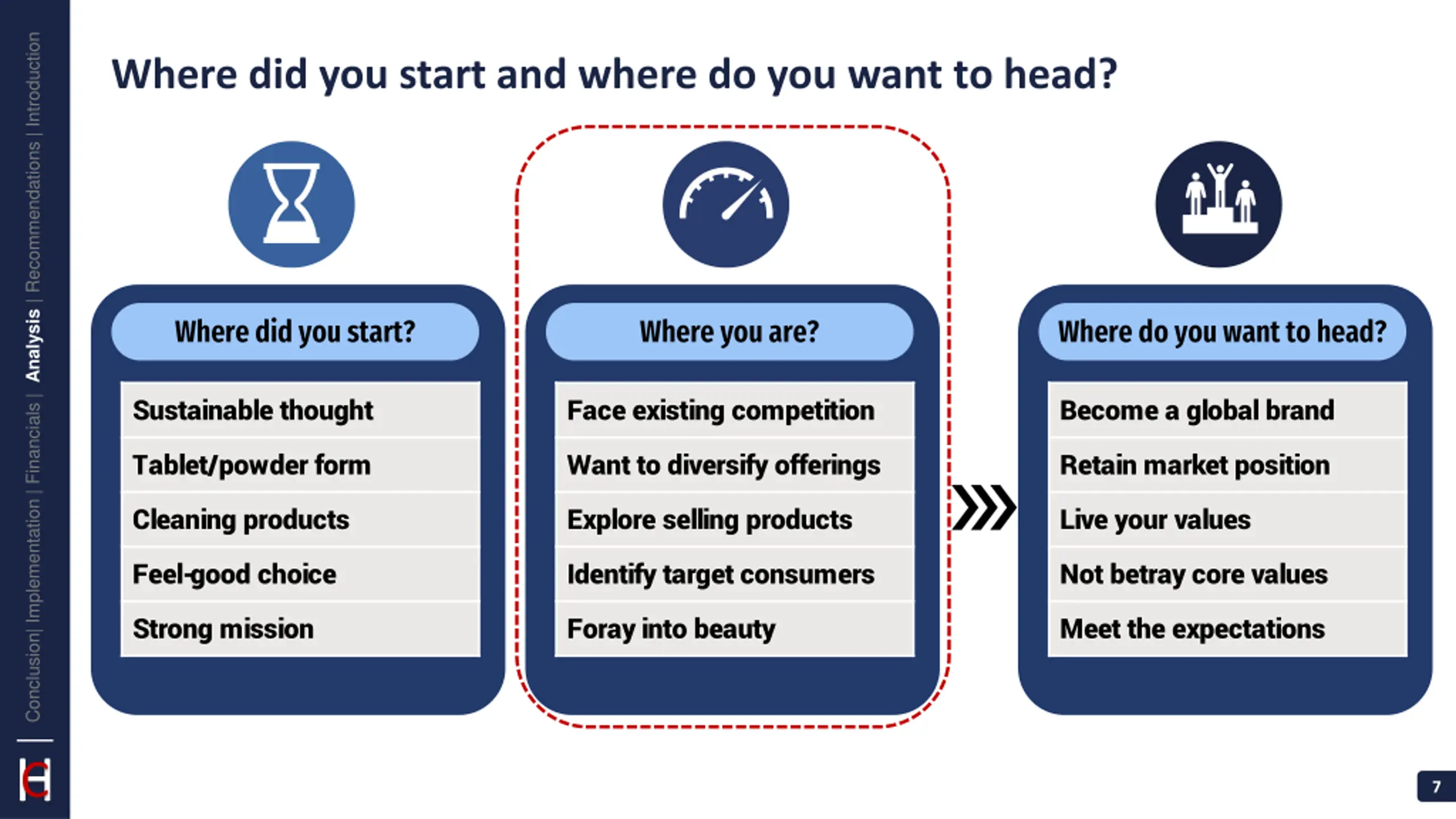 Conclusion| Implementation | Financials | Analysis | Recommendations | Introduction Where did you start and where do you want to head? Where did you start? Where you are? Where do you want to head? Sustainable thought Face existing competition Become a global brand Tablet/powder form Want to diversify offerings Retain market position Cleaning products Explore selling products Live your values Feel-good choice Identify target consumers Not betray core values Strong mission Foray into beauty Meet the expectations H C 7