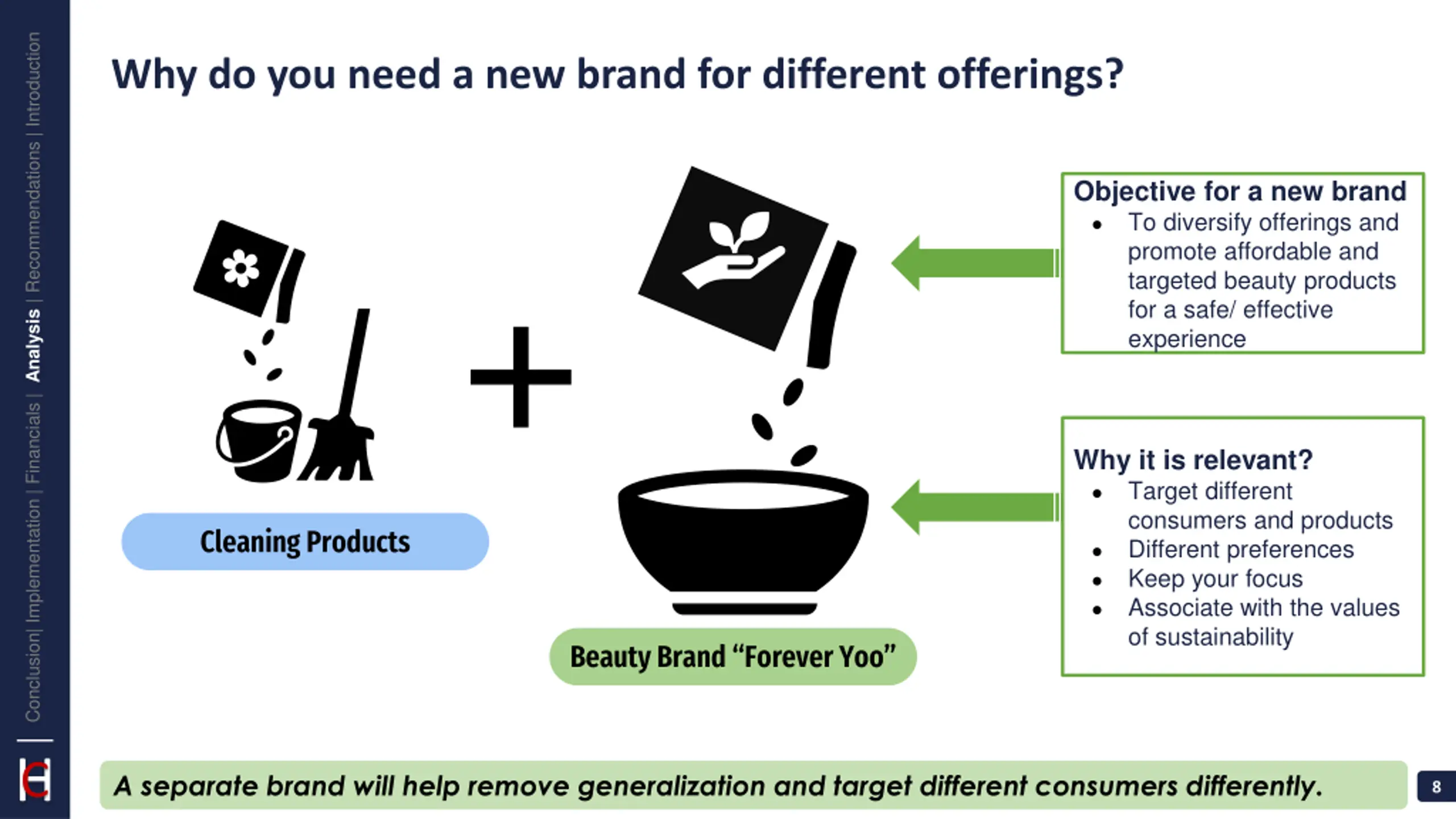 Conclusion| Implementation | Financials | Analysis | Recommendations | Introduction Why do you need a new brand for different offerings? Objective for a new brand To diversify offerings and promote affordable and targeted beauty products for a safe/ effective experience Why it is relevant? Target different consumers and products Different preferences Keep your focus Associate with the values of sustainability Cleaning Products Beauty Brand Forever Yoo H C A separate brand will help remove generalization and target different consumers differently. 8