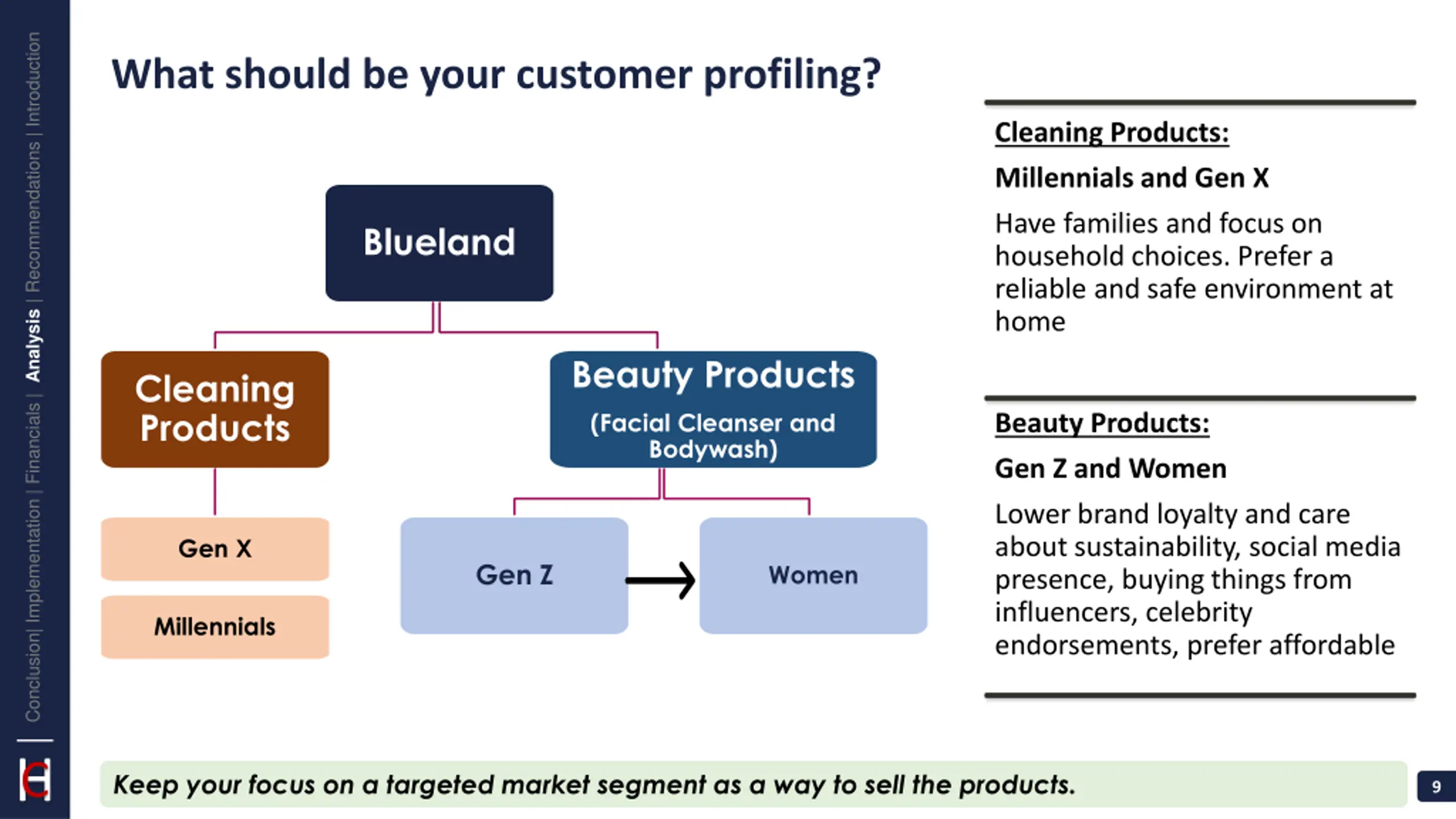 Conclusion| Implementation | Financials | Analysis | Recommendations | Introduction What should be your customer profiling? Cleaning Products: Millennials and Gen X Have families and focus on household choices. Prefer a reliable and safe environment at home Blueland Beauty Products (Facial Cleanser and Bodywash) Cleaning Products Beauty Products: Gen Z and Women Lower brand loyalty and care about sustainability, social media presence, buying things from influencers, celebrity endorsements, prefer affordable Gen X Gen Z Women Millennials H C Keep your focus on a targeted market segment as a way to sell the products. 9