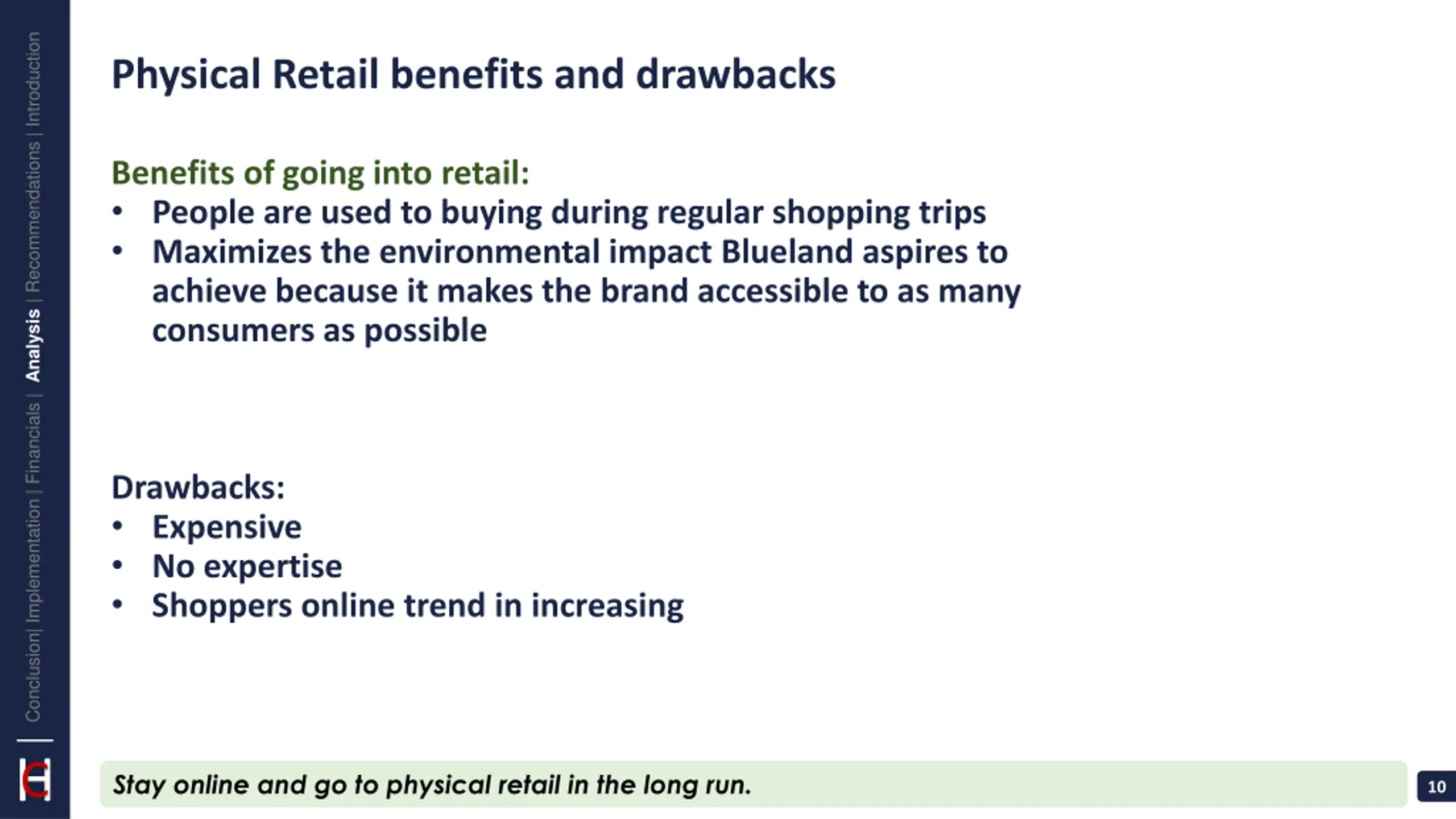 Conclusion| Implementation | Financials | Analysis | Recommendations | Introduction Physical Retail benefits and drawbacks Benefits of going into retail: People are used to buying during regular shopping trips Maximizes the environmental impact Blueland aspires to achieve because it makes the brand accessible to as many consumers as possible Drawbacks: Expensive No expertise Shoppers online trend in increasing H C Stay online and go to physical retail in the long run. 10