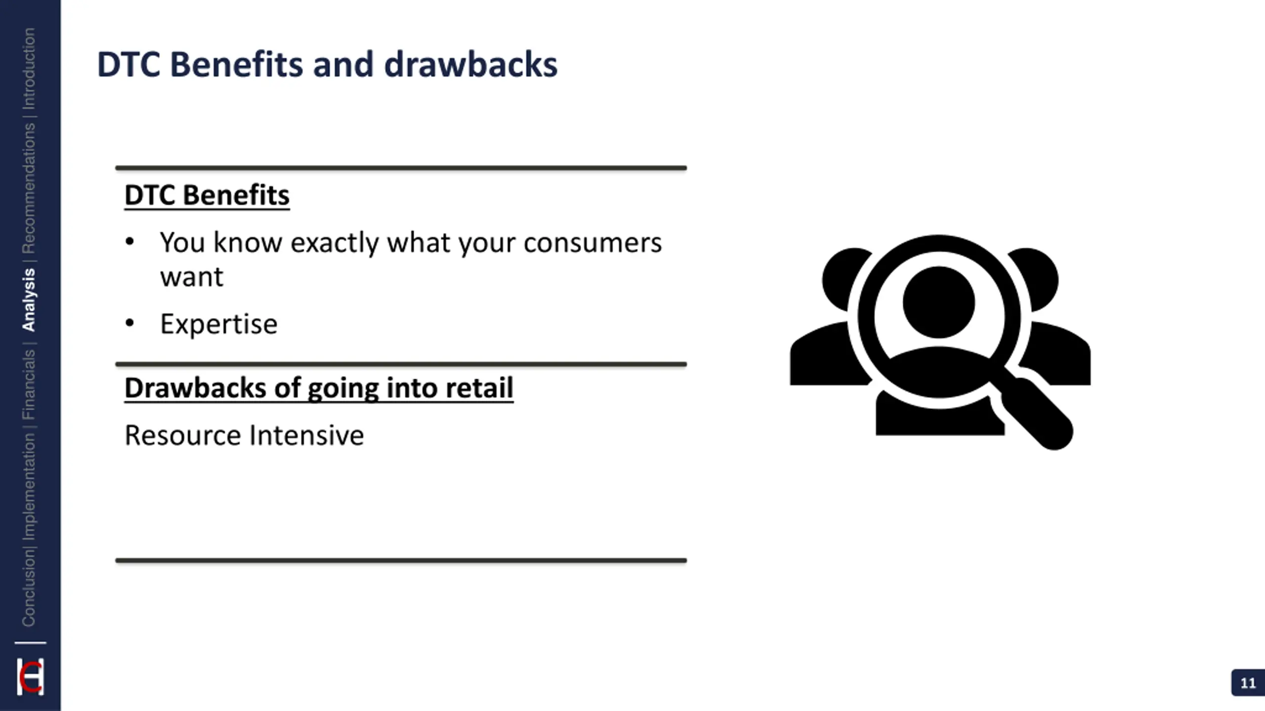 Conclusion| Implementation | Financials | Analysis | Recommendations | Introduction DTC Benefits and drawbacks DTC Benefits You know exactly what your consumers want Expertise Drawbacks of going into retail Resource Intensive H C 11
