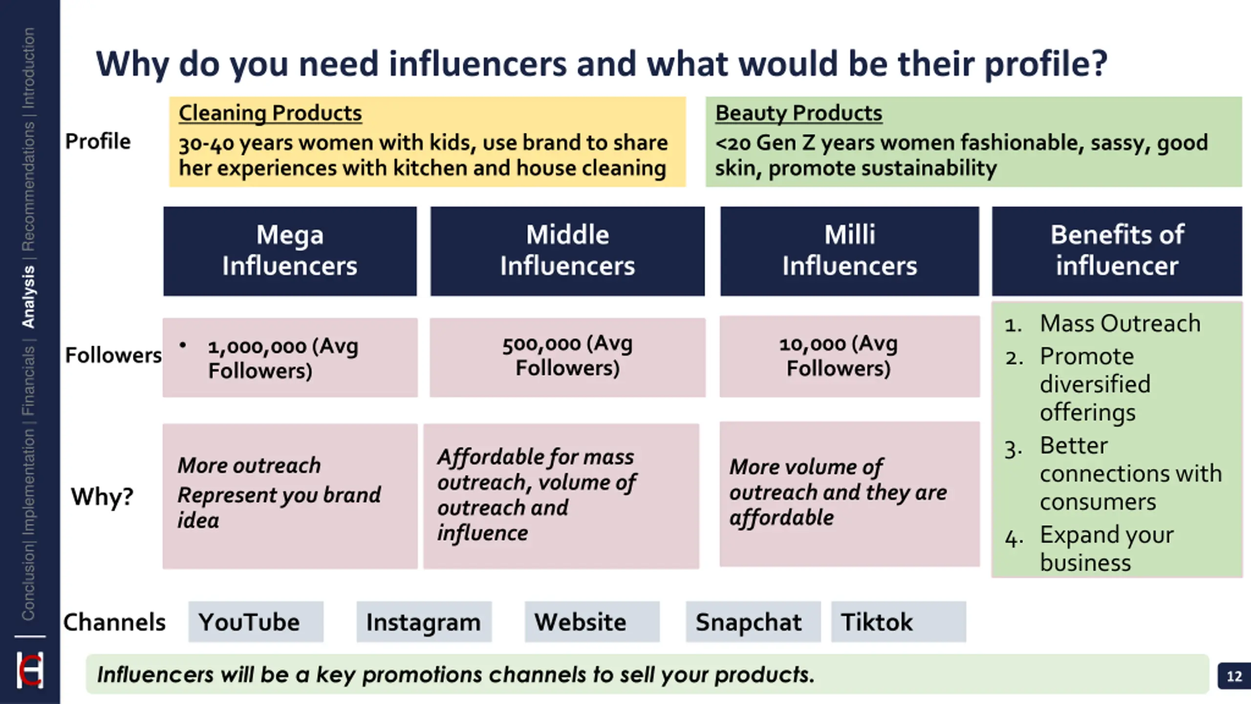 Conclusion| Implementation | Financials | Analysis | Recommendations | Introduction Why do you need influencers and what would be their profile? Cleaning Products 30-40 years women with kids, use brand to share her experiences with kitchen and house cleaning Beauty Products <20 Gen Z years women fashionable, sassy, good skin, promote sustainability Profile Mega Influencers Middle Influencers Milli Benefits of influencer Influencers 1. Mass Outreach 2. Promote diversified offerings 3. Better connections with consumers 4. Expand your business 500,000 (Avg Followers) 10,000 (Avg Followers) 1,000,000 (Avg Followers) Followers Affordable for mass outreach, volume of outreach and influence More outreach Represent you brand idea More volume of outreach and they are affordable Why? Channels YouTube Instagram Website Snapchat Tiktok H C Influencers will be a key promotions channels to sell your products. 12