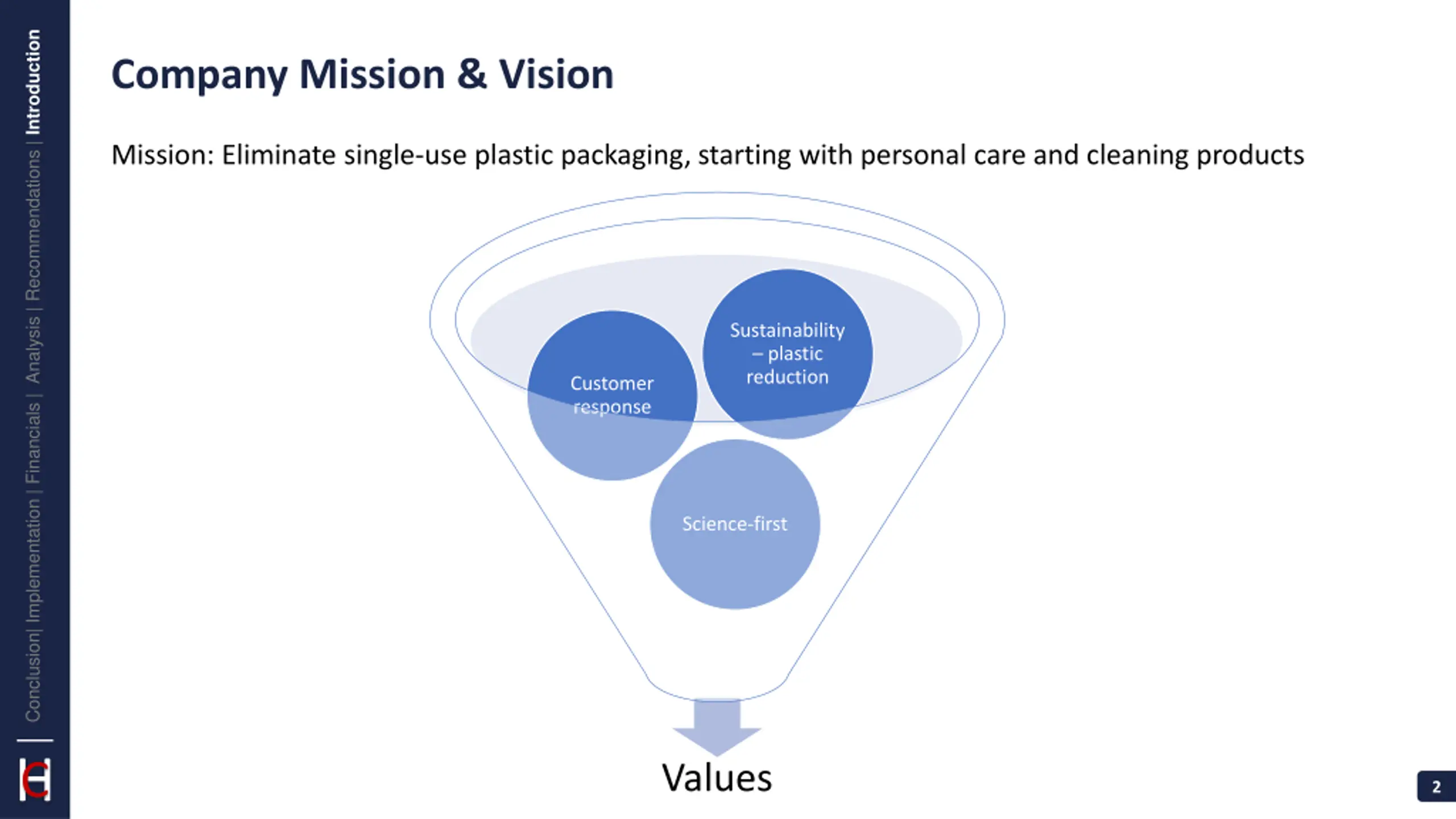 Conclusion| Implementation | Financials | Analysis | Recommendations | Introduction Company Mission & Vision Mission: Eliminate single-use plastic packaging, starting with personal care and cleaning products Sustainability plastic reduction Customer response Science-first H C Values 2